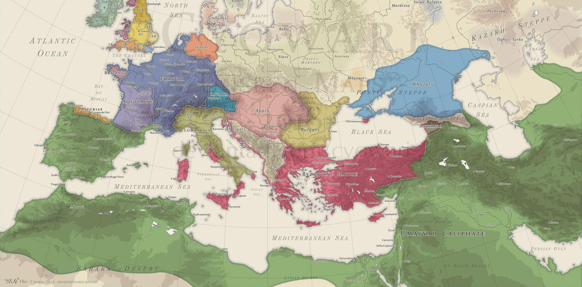 750년 비잔틴 제국. 746년 콘스탄티노스는 시리아를 침공하여 게르마니케이아를 점령하고 키프로스를 탈환했다. 내전으로 750년에 우마이야 왕조가 이베리아 반도로 축소되고 아바스 칼리파국이 대신했다. 황제는 지속적으로 시리아를 침공하여 그 지역의 인구를 트라키아 지역으로 이주시켰다. 이는 인구가 희박한 곳으로 만들어 아랍의 보급을 어렵게 하고 아나톨리아의 안전을 강화시켰다. 757년에 아랍과의 휴전이 이루어졌다. 755년 랑고바르드의 왕 아이스툴프는 라벤나를 점령하여 2세기가 넘게 유지된 비잔틴의 지배를 끝냈다. 이제 교황 스테파노 2세는 프랑크의 왕 피피누스 3세에게 보호를 호소했다.
