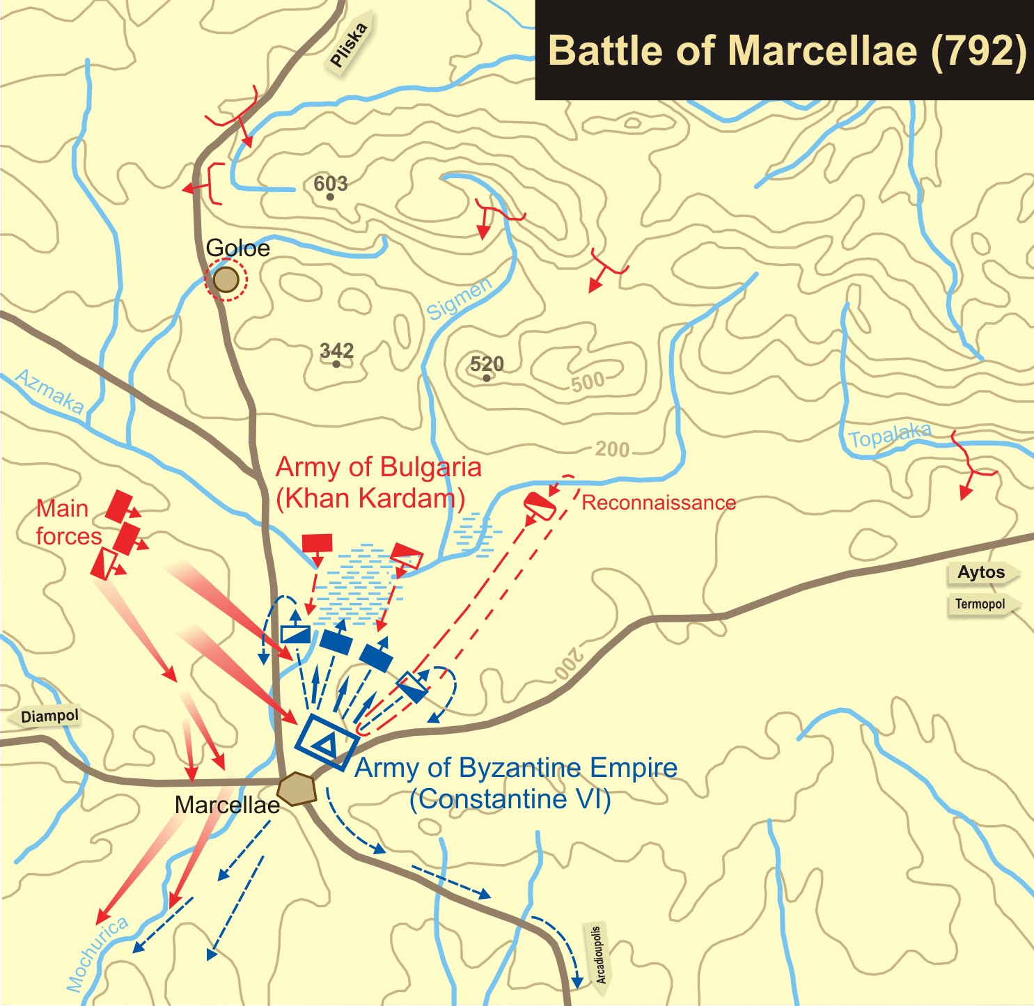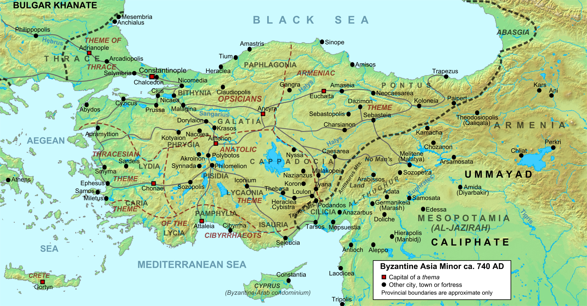 740년경 비잔틴의 동부 국경. 720년부터 재개된 아랍의 공세는 740년 벌어진 아크로이논(아나톨리아 중부) 전투에서 대승을 거두었다. 이미 아르다빌 전투에서 하자르 카간국에게, 파스 전투에서 튀르게시 카간국에게 패배한 우마이야 왕조는 과도하게 확장된 자원으로 인해 더 이상 공세를 이어가지 못하게 되었다. 비잔틴은 하자르, 조지아와 동맹을 맺었다.