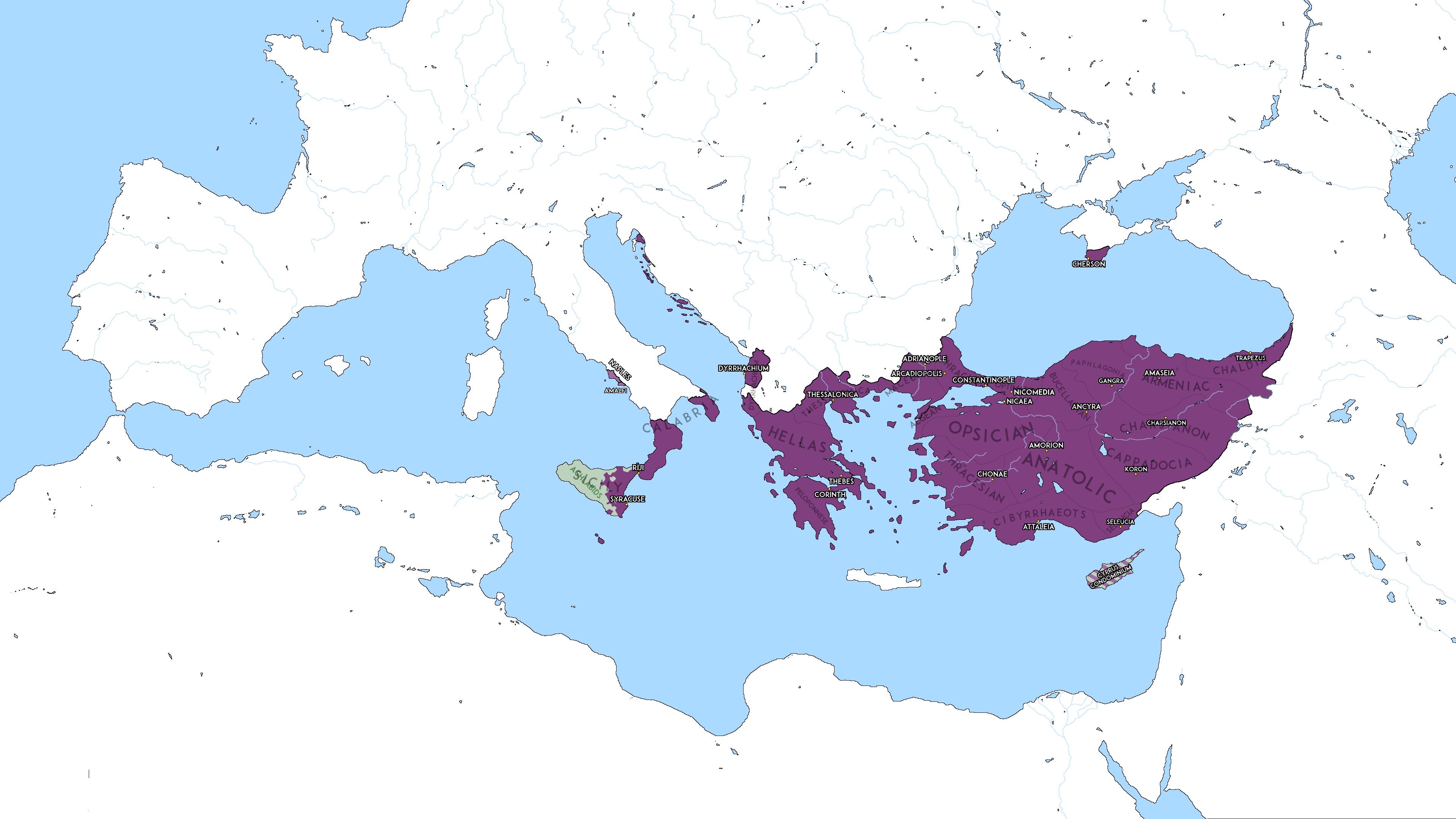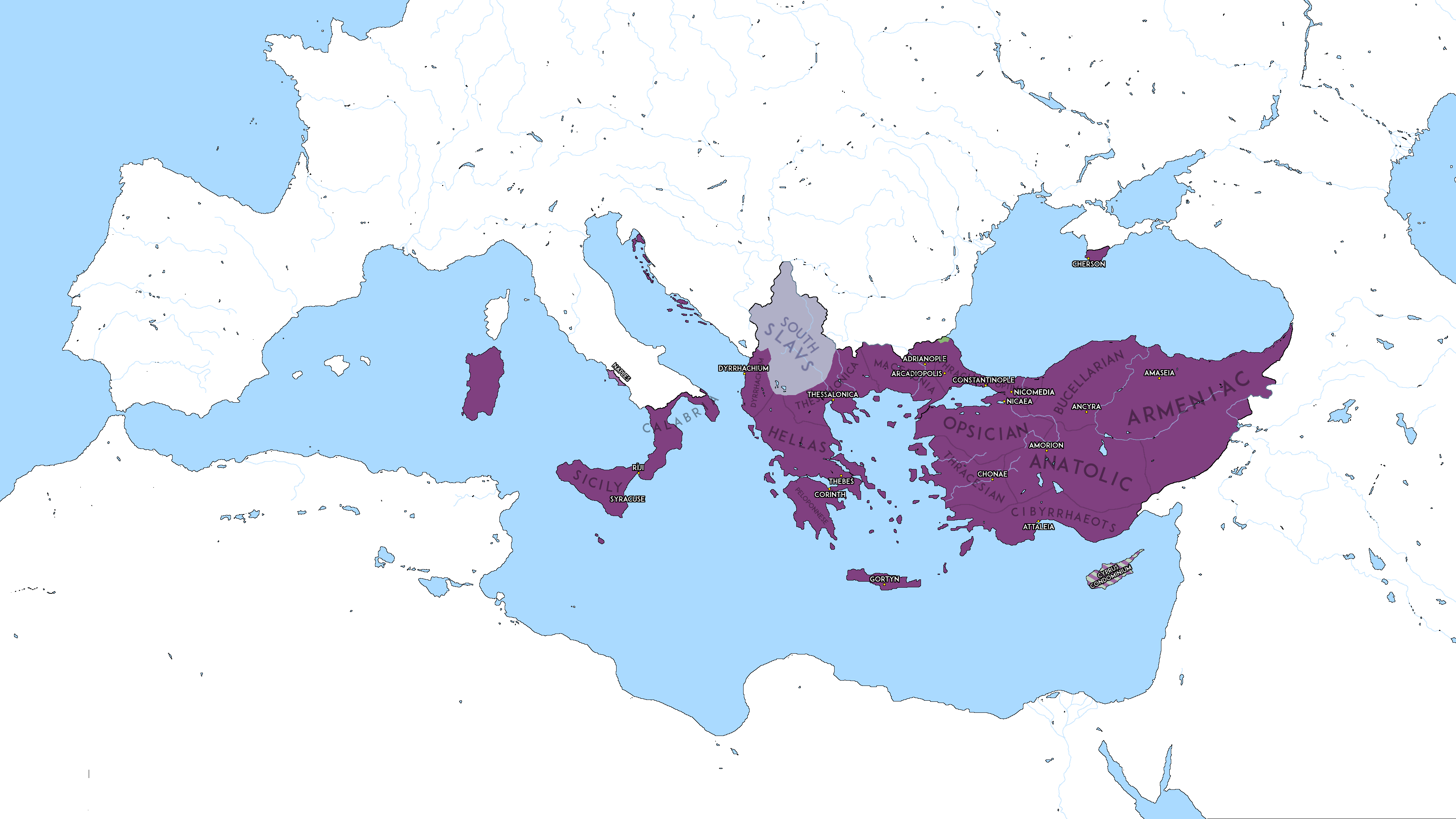 842년경 비잔틴 제국. 831년 팔레르모를 점령한 시칠리아 토후국은 점차 시칠리아 전역으로 세력을 확장해 나갔다. 841년경 베네치아 공화국이 60 척의 갤리선(각 200명의 병력 수송)을 보내 크로토네에서 아랍인을 몰아내기 위해 지원했지만 실패했다.