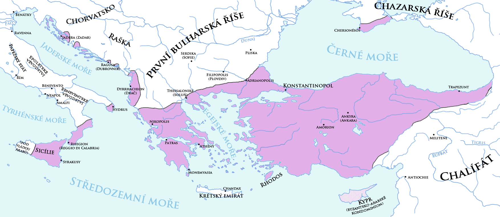 850년경 불가리아 제국. 855-856년에 비잔틴과 불가리아 사이에 분쟁이 일어났다. 불가리아가 동프랑크와의 전쟁에 정신이 팔려 있는 틈을 타 자고라 지역을 포함하여 필리포폴리스(플로브디프), 데벨토스, 안키알로스, 메셈브리아 등 많은 도시를 탈환했다. 863년에는 모라비아의 개종을 확보하고 글라골 문자를 고안하여 슬라브 민족이 정통파 기독교로 개종할 수 있게 했다. 864년 불가리아의 칸 보리스 1세는 정통파 기독교로 개종하고 자고라 지역을 돌려받았다.