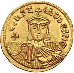콘스탄티노스가 조부 미하일 2세와 함께 새겨진 주화. 콘스탄티노스는 테오필로스의 아들로 그의 친척 안나, 아나스타시아, 그리고 장래의 미하일 3세도 출생 직후에 왕관을 썼기 때문에 그 역시 황제로 승격되었을 가능성이 있다.