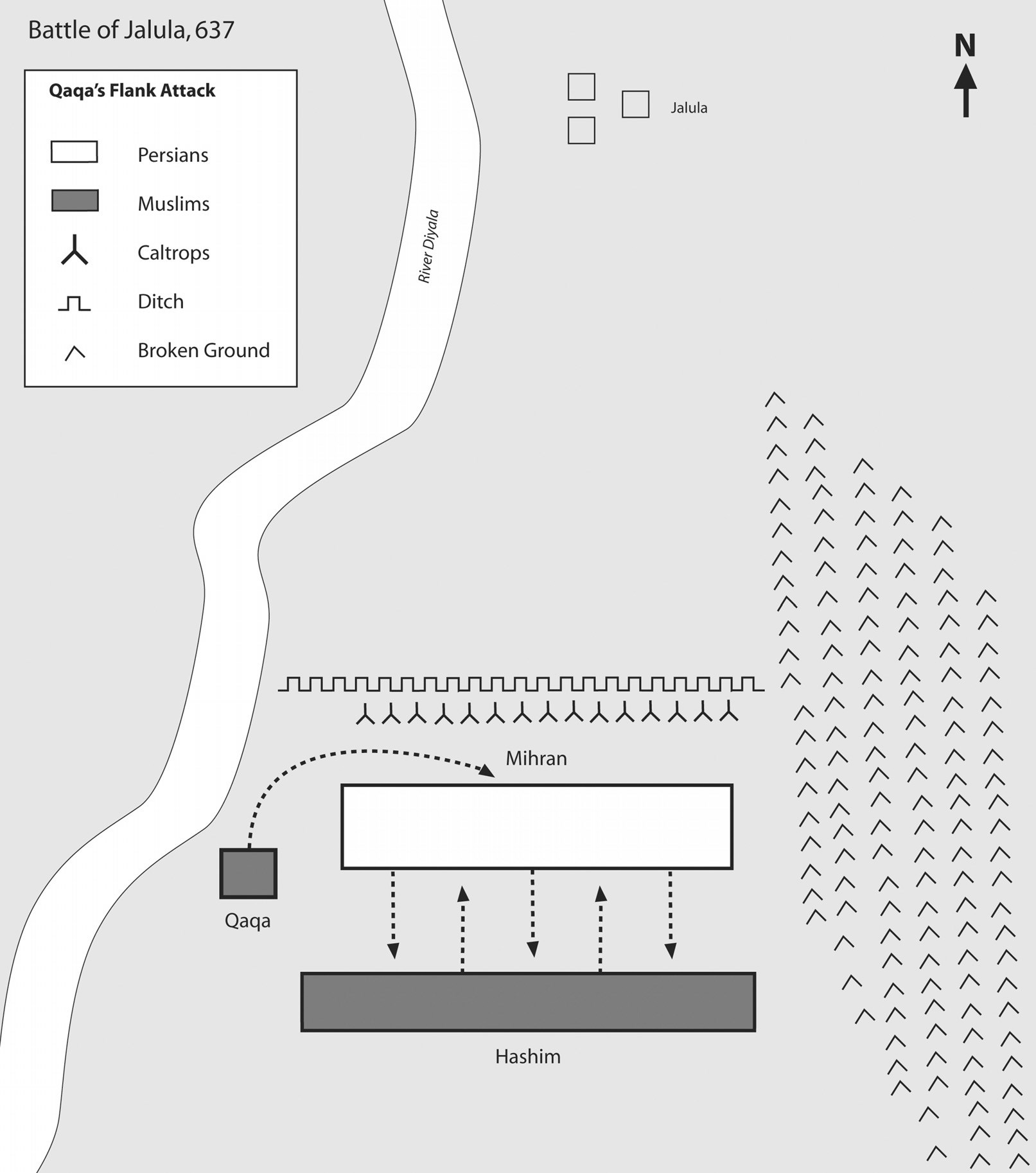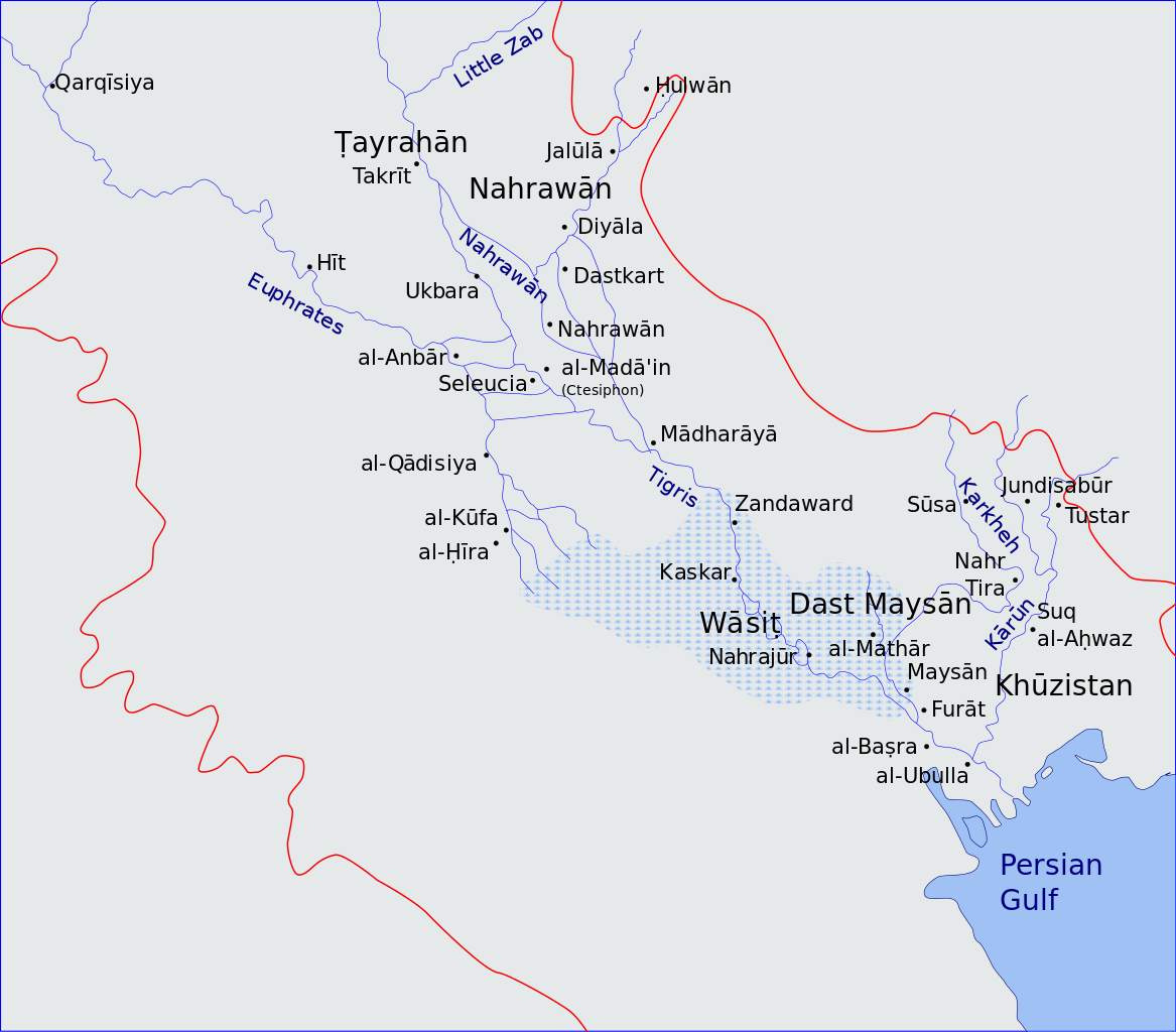 637년 4월 잘룰라 전투의 지도. 사산 왕조의 수도 크테시폰이 점령되었지만 도시 북동쪽의 잘룰라와 티그리스 강 북부의 티크리트와 모술의 페르시아군은 위협적이었다. 특히 수도에서 철수한 페르시아군은 잘룰라에 집결 중이었다. 칼리파 우마르는 티그리스 북부보다 잘룰라를 우선적으로 공격하도록 지시했다. 637년 4월, 하심 이븐 우스바가 이끄는 무슬림 원정군이 미흐란이 지휘하는 페르시아군에게 승리하고 잘룰라를 7개월의 포위 끝에 점령했다.