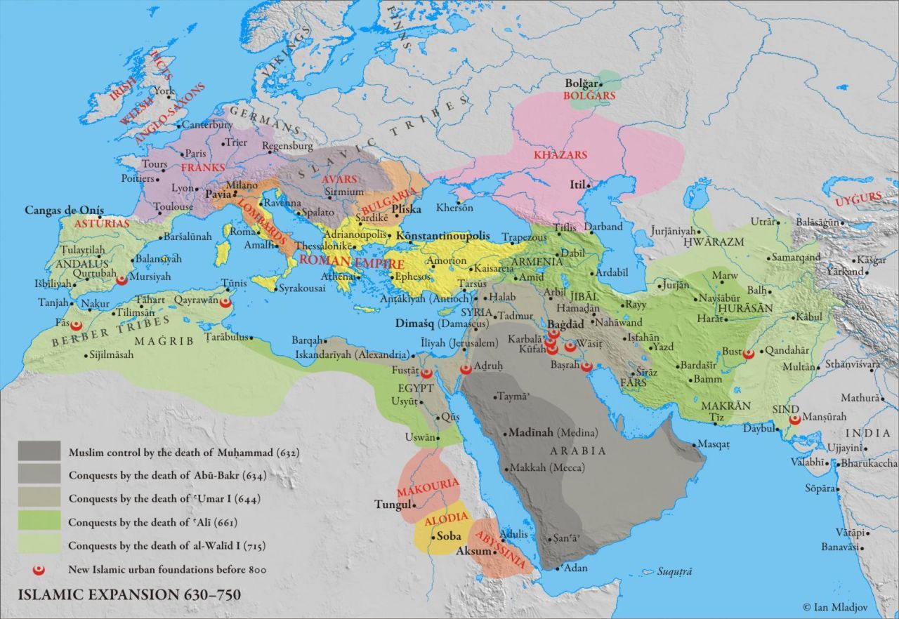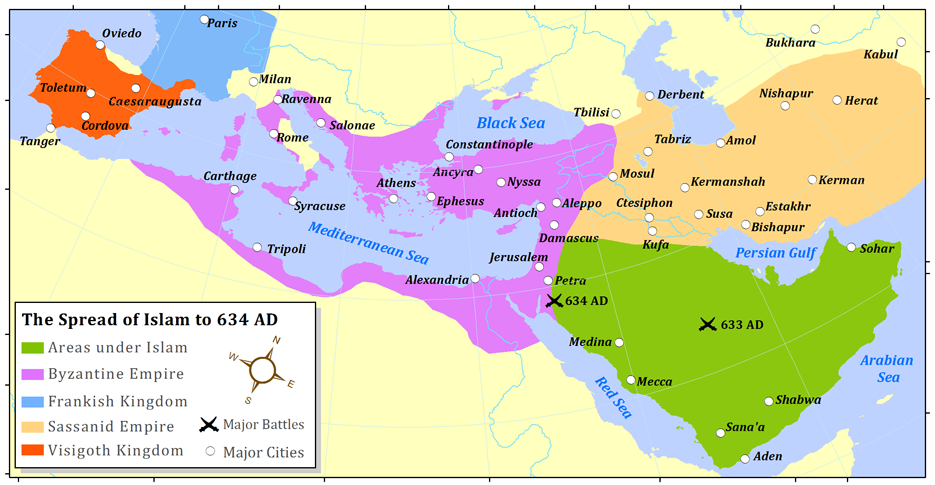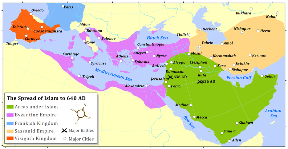 이슬람의 초기 정복을 나타낸 지도. 결정적인 승리를 거둔 전투를 표기했다. 636년 야르무크와 알 카디시야에서 벌어진 전투에서 승리하기 전까지 무슬림은 완전한 우위를 점하지 못했다. 이들 전투 이후 비잔틴은 레반트 지역을 포기하게 되고 저항할 힘을 잃은 페르시아는 망국의 길을 걷게 된다.