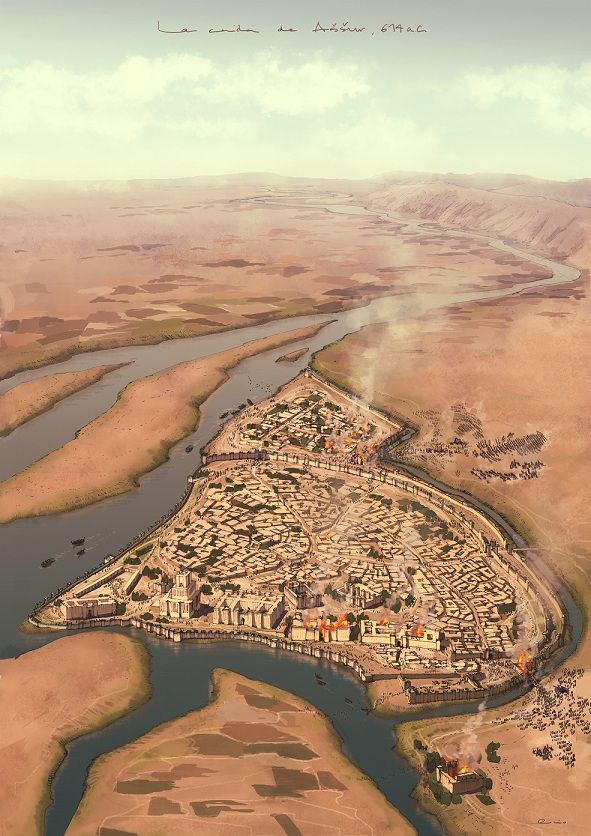 고고학에 따르면 도시는 B.C.3천년 중반에 세워졌다. 이 시기는 B.C.25~21세기에 아시리아가 출현하기 전인 수메르 시대였다. 도시의 가장 오래된 유적은 이슈타르 사원의 기초와 고궁에서 발견되었다. 이후 기간에 도시는 아카드 제국의 왕들에 의해 통치되었다. 우르의 제3왕조 동안에는 수메르인의 지배를 받는 아시리아 총독에 의해 통치되었다.