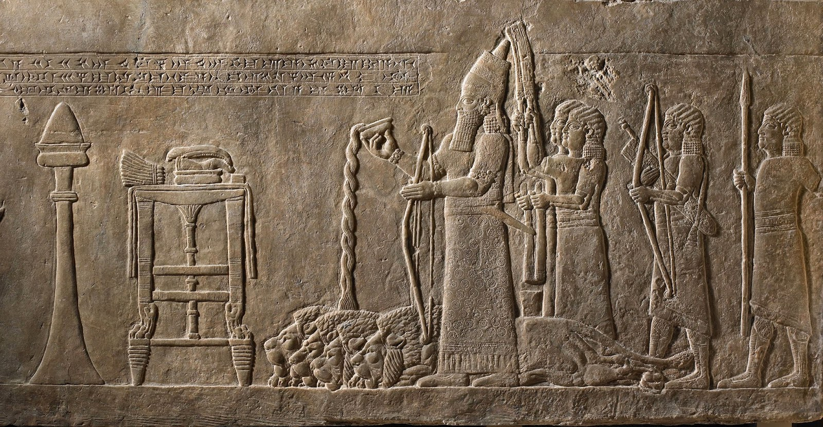 아슈르바니팔 왕이 죽은 사자 위에 헌주(獻酒)을 붓는 것을 보여주는 부조, 니네베, B.C.645-640