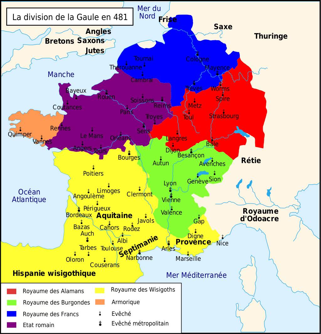 454년 샬롱(카탈라우눔 평원)의 승리자인 로마의 장군 아이티우스가 죽은 후, 갈리아에서 제국의 권력은 급속히 붕괴되었다. 461년 살해되기 전에 마이오리아누스 황제(재위 457-461년)가 임명한 로마 갈리아의 마기스테르 밀리툼인 아이기디우스 치하의 갈리아 북부 수아송 왕국(나중에 네우스트리아)이 로마 잔재 국가로 등장했으며, 그가 동쪽으로는 프랑크족에, 남쪽으로는 서고트족에 맞서 권력을 유지하면서 동시대 갈리아의 혼란이 가중되었다. 그의 아들 시아그리우스가 465년에 뒤를 이어 수아송의 통치자가 되었다.
