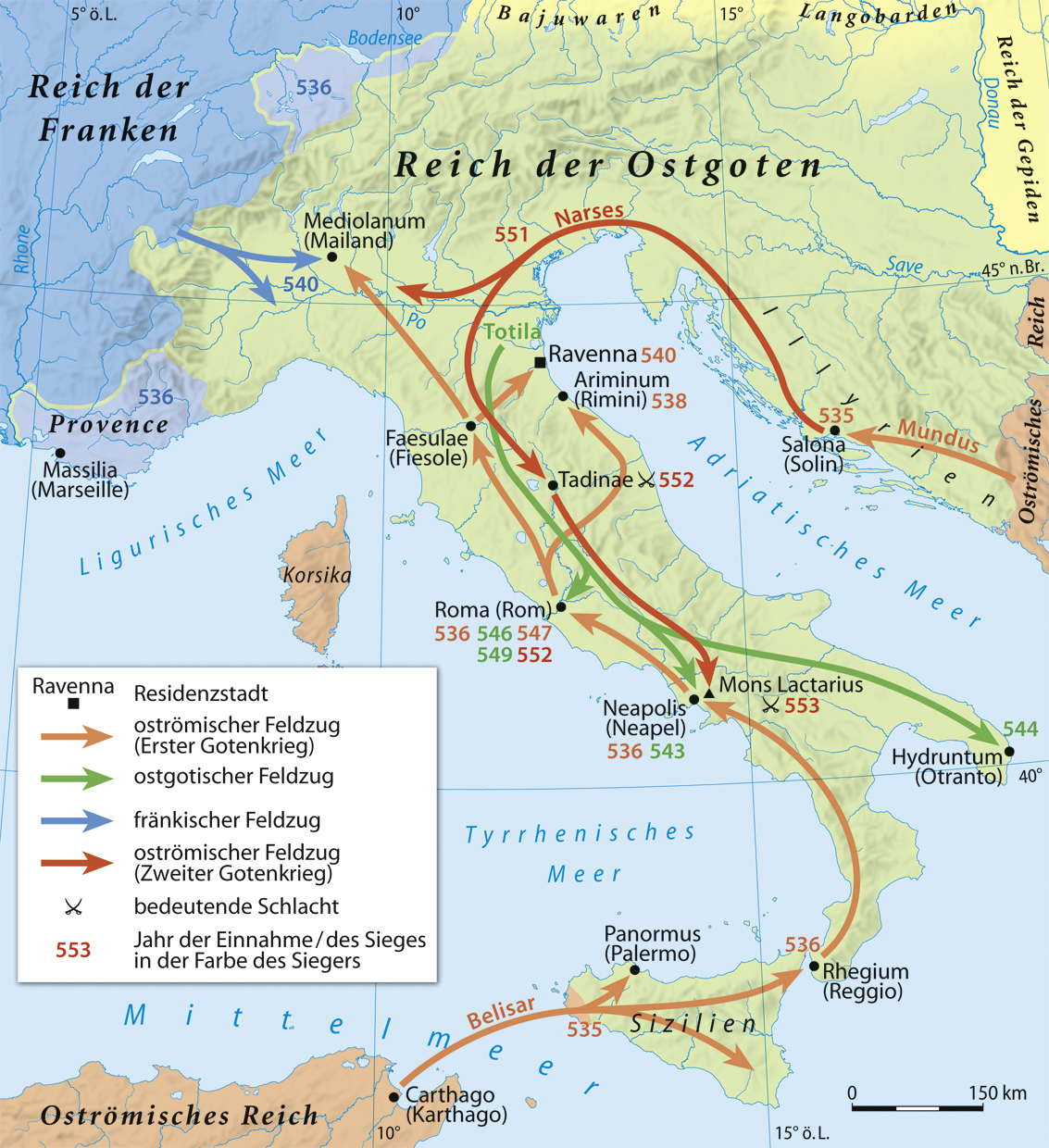 처음에는 벨리사리우스가, 나중에는 나르세스가 이끈 유스티니아누스의 이탈리아 침공은 동고트족 역사의 마지막 장을 열었다. 534년부터 552년까지 지속된 고트 전쟁은 이탈리아와 동고트족 모두에게 치명적이었다. 전쟁의 시작 단계에서 테오다하두스의 약점으로 인해 침략군은 빠른 승리와 많은 성공을 거두었다. 벨리사리우스는 536년에 로마에 도착했고, 테오다하두스는 비티기스를 위해 폐위되었다. 비티기스의 부상과 두 번째 비잔틴 장군 나르세스의 도착은 제국의 진척을 둔화시켰다. 나르세스가 소환되었을 때, 벨리사리우스는 다시 공세를 펼쳤고, 아마도 벨리사리우스가 황제 칭호를 수락하는 것을 포함하여 비티기스가 필사적인 조치를 취하도록 강요했을 것이다. 비록 이러한 내용은 불확실하지만 벨리사리우스는 540년에 소환되면서 동고트족의 왕을 데리고 갔다. 541년 비티기스를 대신하여 토틸라가 왕이 되었다.