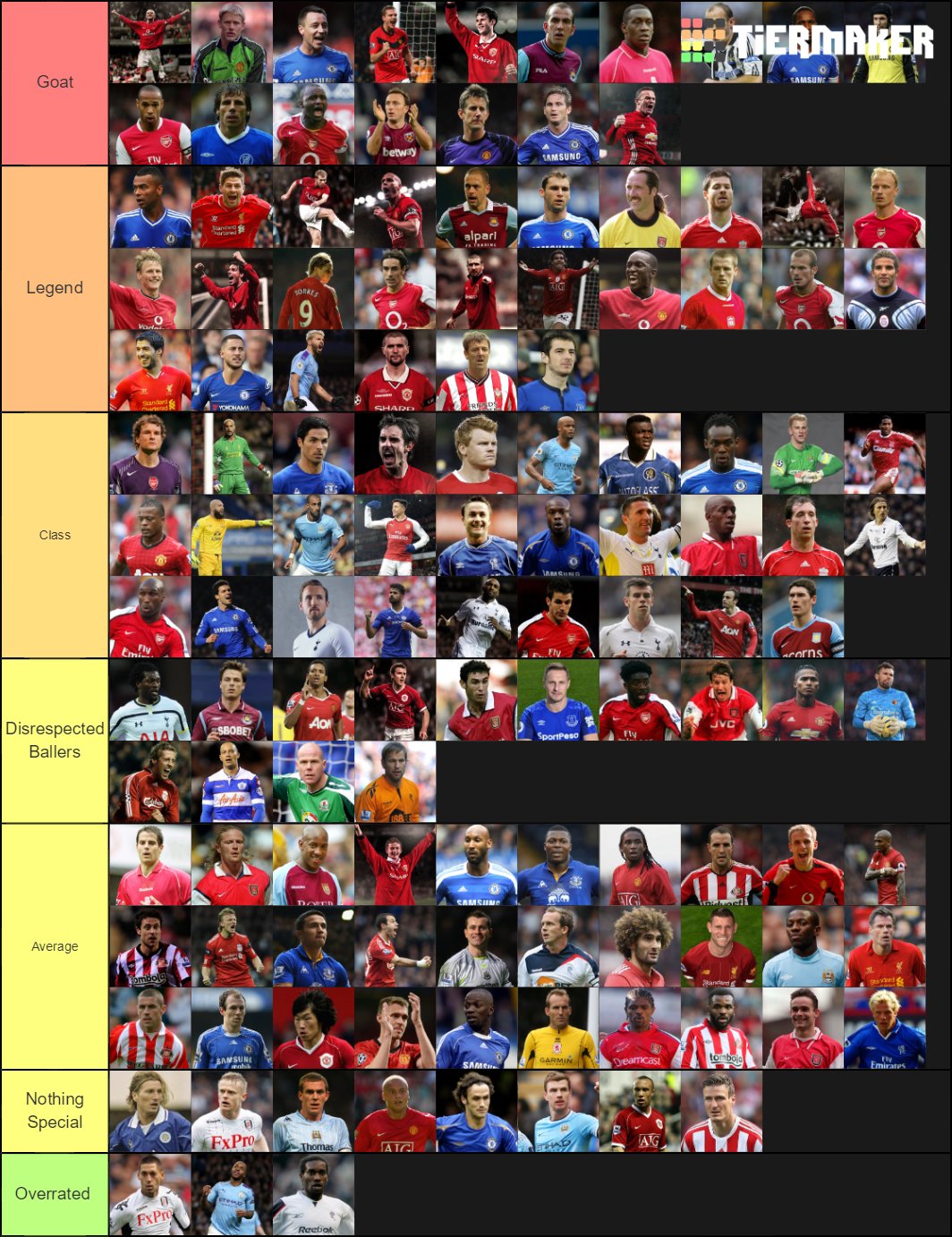 한 축구팬이 'GOAT'(Greatest Of All Time)에서 '과대평가'까지 프리미어리그 레전드 랭킹을 매긴 티어메이커를 만들었다.