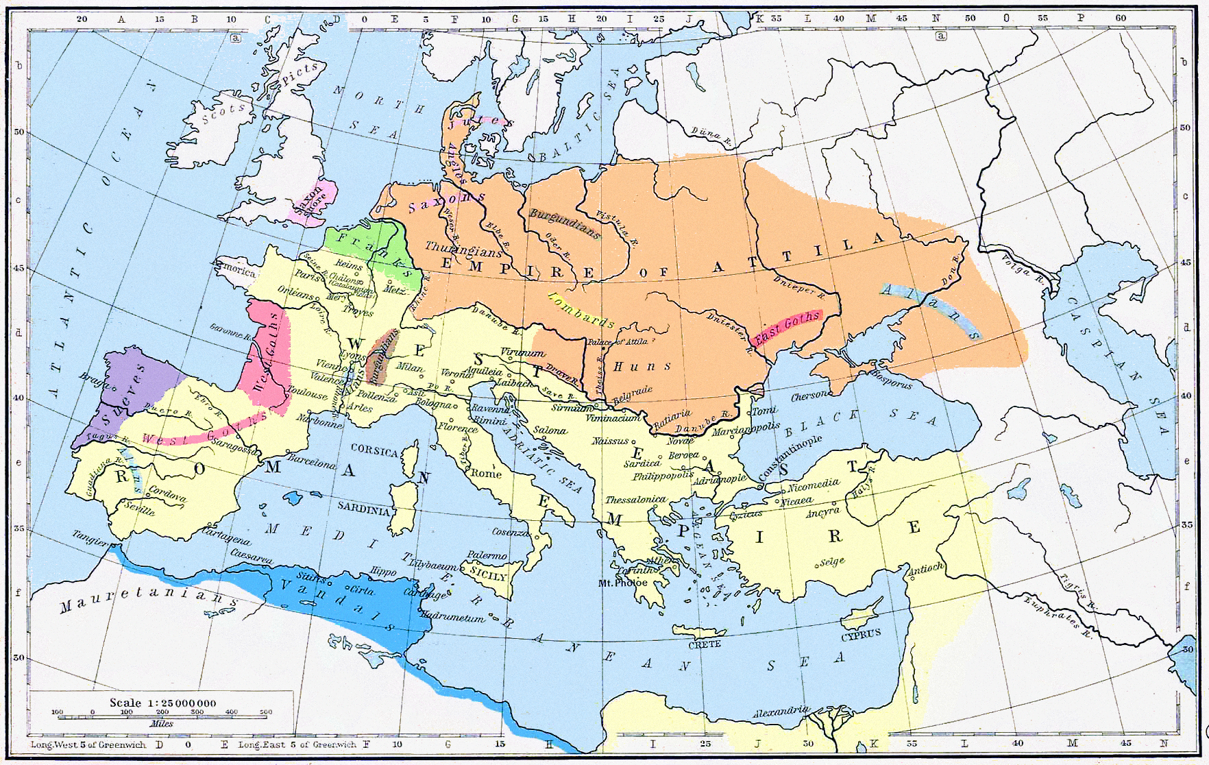훈 제국은 로마인(서로마 제국)과 그리스인(동로마 제국)의 두 제국에 그가 심어준 두려움 때문에 "신의 채찍"이라는 별명이 붙은 아틸라 왕(434-453년) 치하에서 권력의 정점에 도달했다.