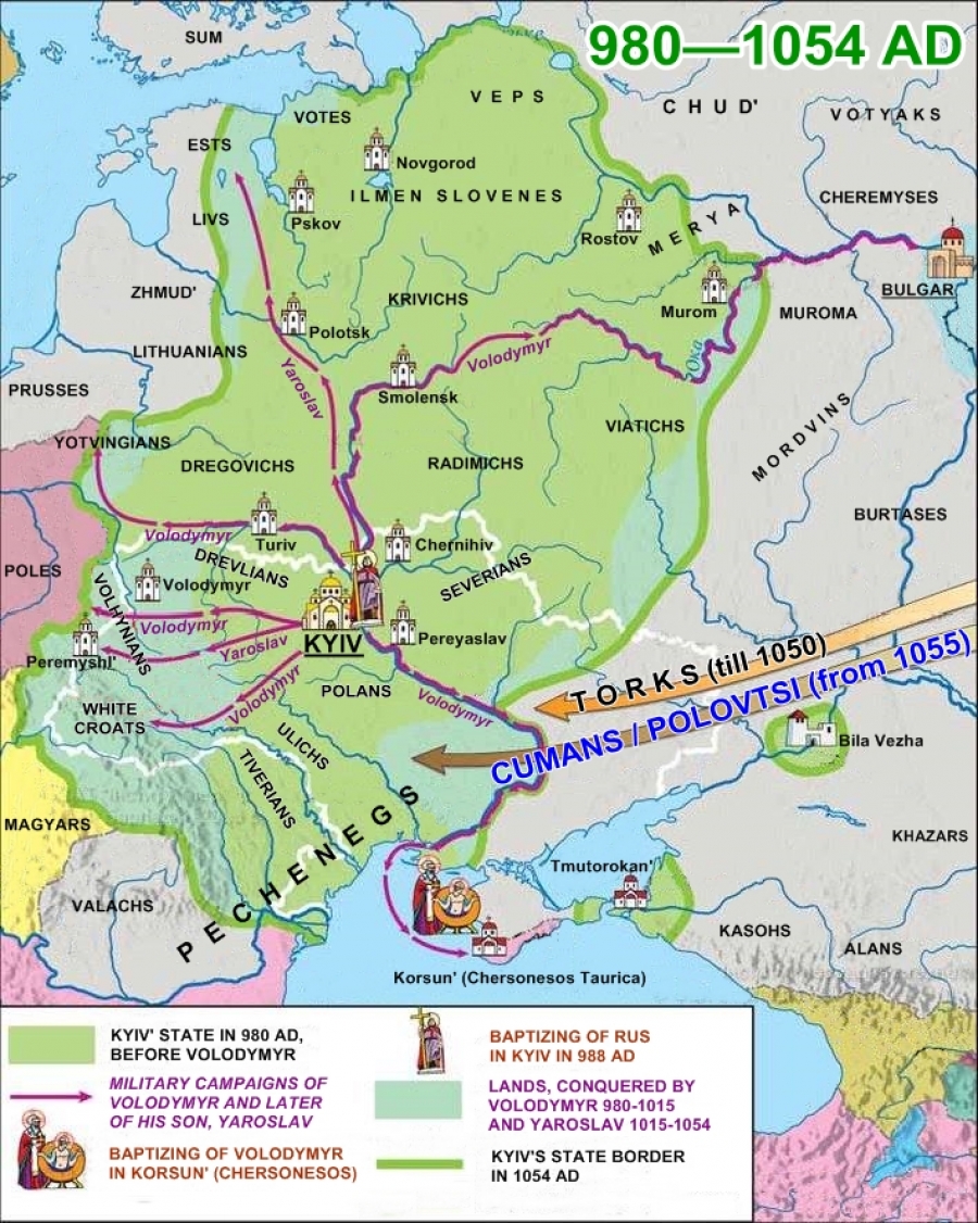용맹공 스뱌토슬라프 1세는 역사상 처음으로 나중에 중앙 모스크바(러시아)가 되는 잘레시에 땅을 키이우에 종속시켰으며, 당시 이 땅에는 핀우그리아 부족(메랴, 뮈로마, 메셰라, 에르자, 모크샤 등)이 거주했다. 964년부터 966년까지 스뱌토슬라프는 뱌티치 부족을 정복하고 이제는 하자르가 아닌 키이우에 공물을 바치라고 명령했다.