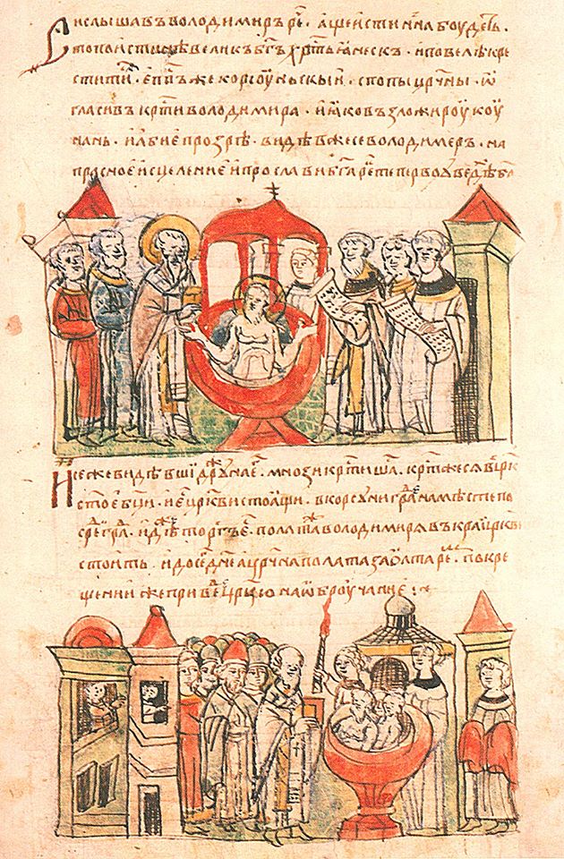 볼로디미르는 988년 키이우와 그 인근 지역에만 세례를 베풀었으며, 키이우의 통치하에 있던 다른 지역에서 이교도들은 점차적으로 물러났다. 노브고로드에서는 이교도들의 반란이 무력으로 진압되어야 했으며, 수즈달에서 볼크베(이교도 사제)들은 키이우인이 세례를 받은 지 150년이 지난 후에도 기독교에 대한 반란을 선동했다. 1130년대에 이르러서도 뱌티치 이교도들은 키이우 동굴에서 온 설교자 쿠크샤를 처형했다.