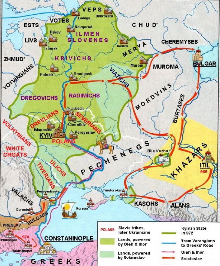 용맹공 스뱌토슬라프 1세는 역사상 처음으로 나중에 중앙 모스크바(러시아)가 되는 잘레시에 땅을 키이우에 종속시켰으며, 당시 이 땅에는 핀우그리아 부족(메랴, 뮈로마, 메셰라, 에르자, 모크샤 등)이 거주했다. 964년부터 966년까지 스뱌토슬라프는 뱌티치 부족을 정복하고 이제는 하자르가 아닌 키이우에 공물을 바치라고 명령했다.