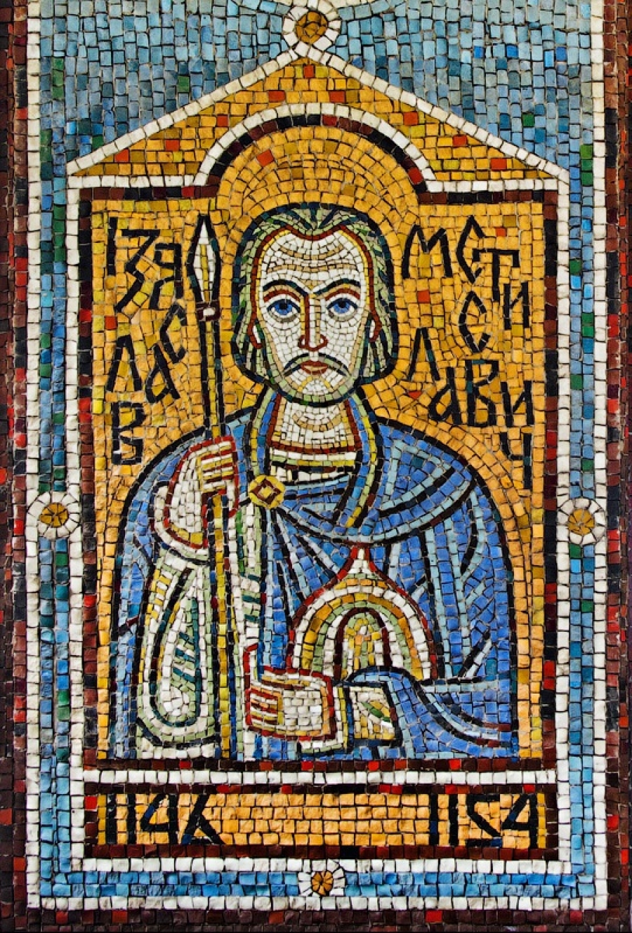 이자슬라프 대공(위의 모자이크 인물, 재위 1146-1154년)은 위대한 므스티슬라프와 스웨덴 공주 크리스티나의 아들이다. 그의 주요 상대는 볼로디미르 2세 모노마흐와 그의 두 번째 부인 비잔티움 출신 에우피미아의 아들이자 키이우 국가 북동쪽에 위치한 수즈달(잘레시에, 지금의 모스크바)의 군주인 삼촌 유리 돌고루키(긴 팔의 유리)였다. 유리는 유난히 긴 팔 때문에 그 별명을 받았다.