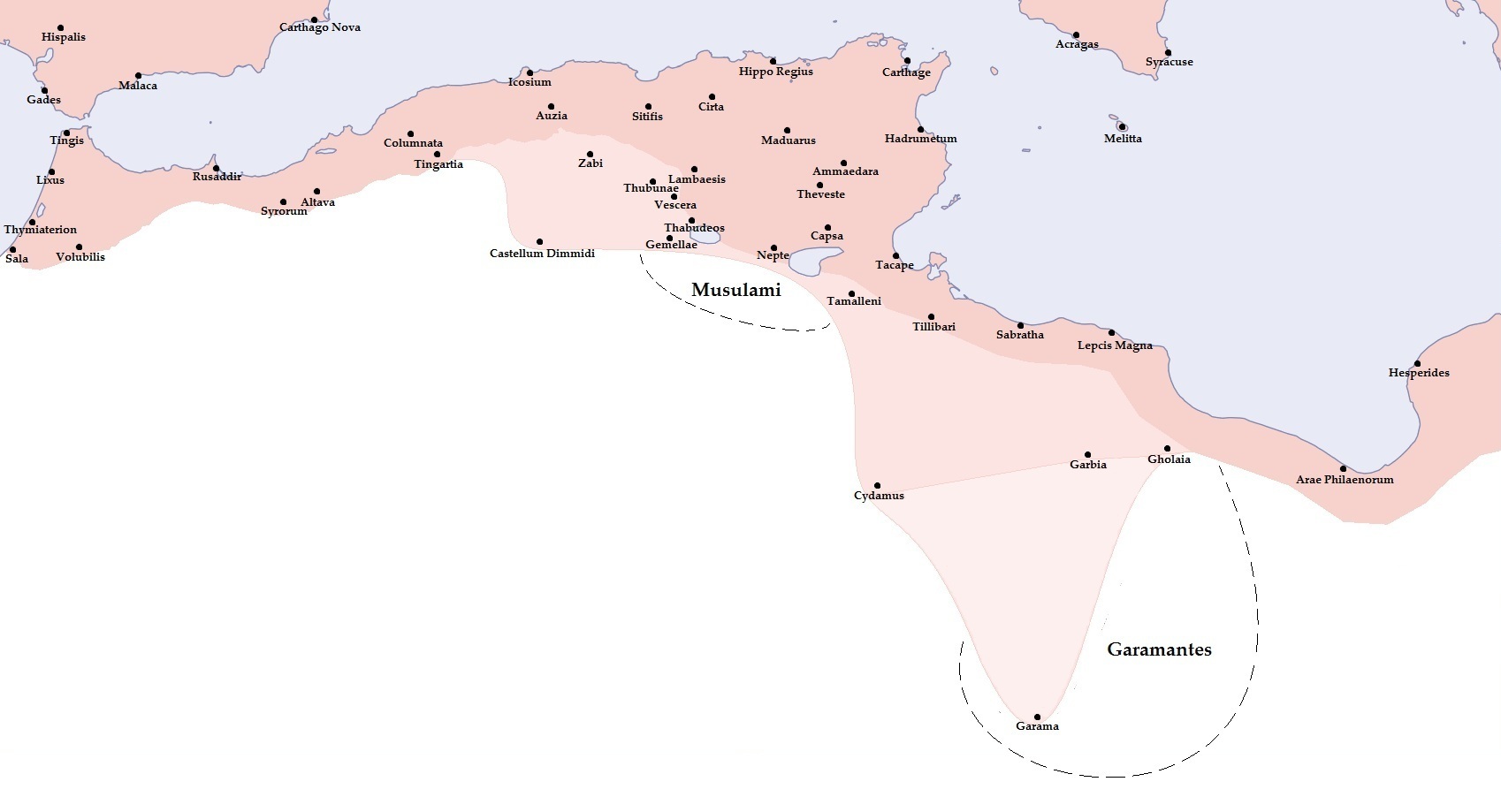 - 누미디아 :  BC 105년 유구르타 전쟁이 끝나고 누미디아 동부의 영토가 로마의 아프리카 속주로 합병되면서 만들어졌다.