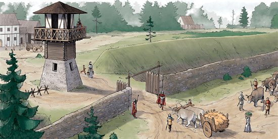 방어시설은 지름 30 cm의 오크 통나무 울타리로 만들어졌으며 1 m와 3 m 높이로 땅에 박혔다. 강과 접하지 않은 모든 경로에는 요새와 망루를 갖추고 있었다.