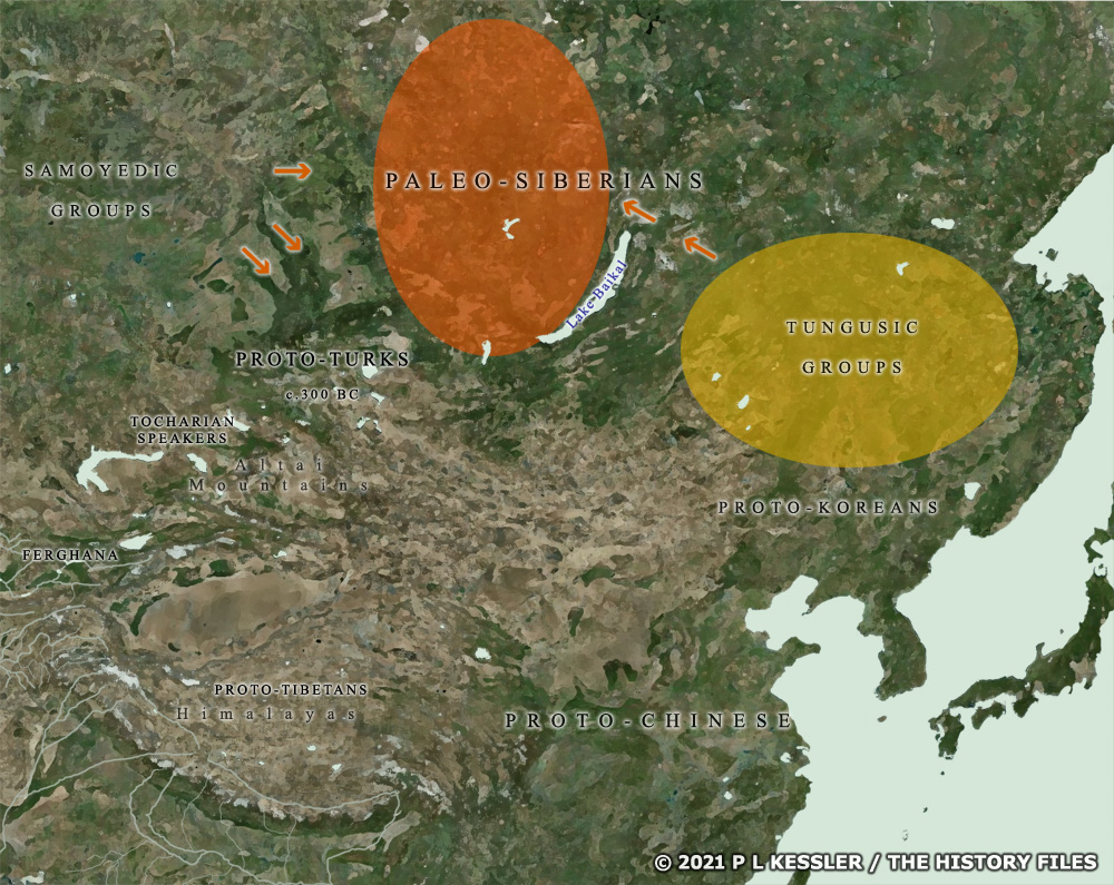 이 지역의 초기 원주민인 고시베리아인은 약간 이동하여 오늘날까지 존속하고 있지만, 이 새로운 도착자들에 의해 대부분 수몰되었다. 오늘날 시베리아에 있는 베링해 해안선의 니브흐인의 경우에는 외딴곳에서 존속을 형성하고 있다.
