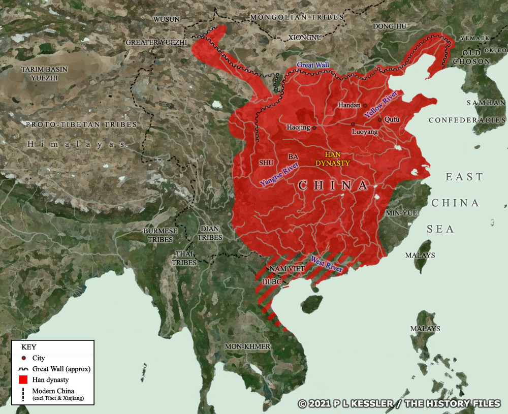 이어서 한나라는 점차 이웃한 영토로 확장하여, 특히 남쪽의 전(滇, Dian)으로부터 영토를 빼앗고 오늘날 중국의 일부를 구성하는 영토를 포함하고 있는 남월 왕국을 정복했다. 북쪽과 서쪽의 유목민 부족들을 제압하려는 시도도 있었지만, 결국 그다지 성공적이지 못했다.