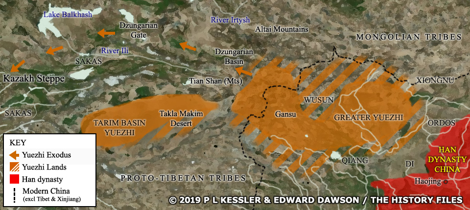 대월지는 한의 북서쪽에 있는 목초지를 지배하기 위한 오랜 투쟁 끝에 흉노에게 패배하고 간쑤 지역(甘肃省)에서 쫓겨났으며, 중앙아시아로의 이주 경로는 그들이 발하시 호 아래의 일리강 유역에 정착하기 위해 시도하고 정착한 사실로 미루어 볼 때 꽤 쉽게 추론할 수 있다.