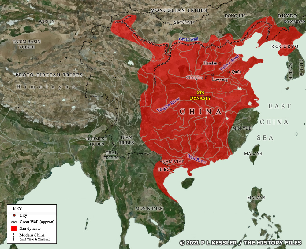 지도는 전한 말과 거의 똑같았고, 왕망의 통치하에 베트남 북부 정복은 지속되었으며, 고창으로 향하는 북서쪽 회랑의 통제만 조금 확장되었다.