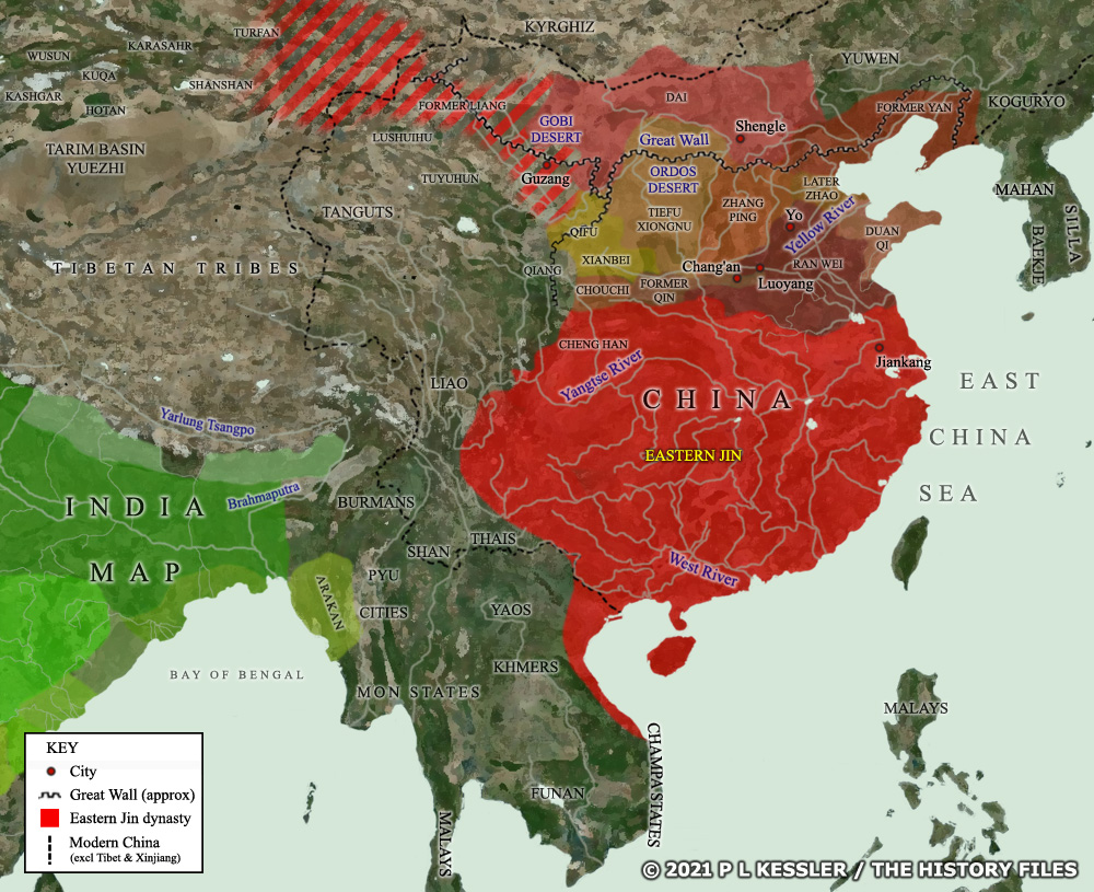 동진은 옛 제국의 남동쪽으로 철수함으로써 북쪽의 멸망에서 살아남았다. 북쪽은 끊임없이 변화하는 국가와 경계의 모자이크로 분열되어 결국 북위(魏)가 단일 지배 세력으로 부상했다. 중국은 이제 분명히 둘로 나뉘었고, 전투에서 한 번의 큰 승리가 하나의 중국 제국을 재형성하는 결정적인 행동이 될 수 있었다.