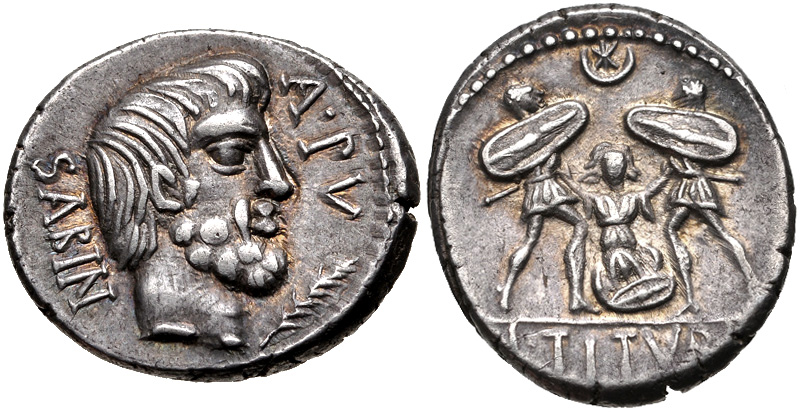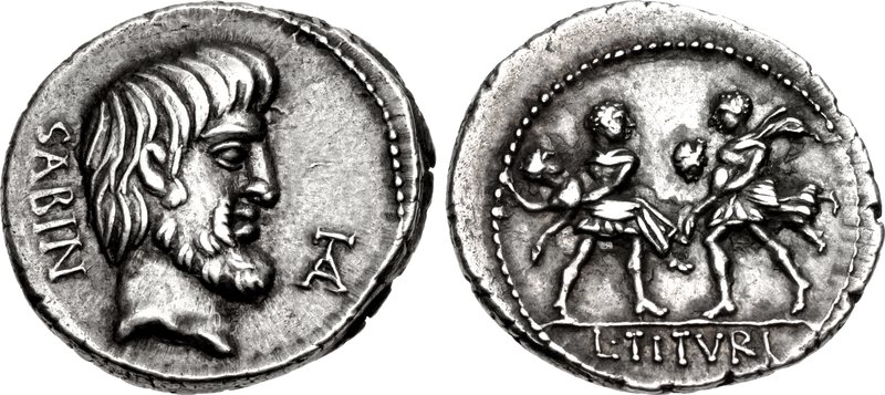 BC 89년 루키우스 티투리우스 사비누스가 주조한 2개의 로마 공화국 데나리우스 은화. 둘 다 앞면에 사비니 왕 티투스 타티우스가 그려져 있다. 뒷면에 로마 병사에게 납치되는 사비니 여인들(위)과 사비니족에게 처벌받는 타르페이아(아래)가 그려져 있다.
