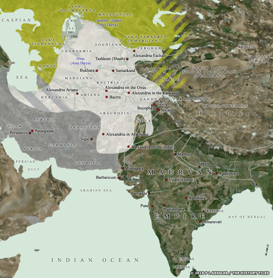 박트리아 왕국(하얀색)은 BC 200-180년경에 세력이 최고조에 달했고, 남동쪽에서 새로운 정복이 이루어졌으며, 마우리아 제국이 붕괴 직전에 있던 인도를 잠식했다. 북부와 동부 국경 주변에는 결국 그리스 왕국의 몰락에 기여하게 되는 다양한 부족인 사카족과 토하라인이 살았다.