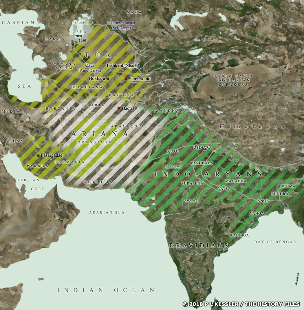 BC 2200-1700년경 사이에 이란과 중앙아시아(메소포타미아, 이집트는 말할 것도 없이)에서 기후 변화로 인한 토착 문명과 문화가 붕괴함에 따라, 인도 이란인 집단들은 아랄해와 시르다리아 강에서 점차 남쪽으로 이동했으며 그들의 분파인 인도 아리안족은 인도로 진입했다(녹색 사선으로 표시).