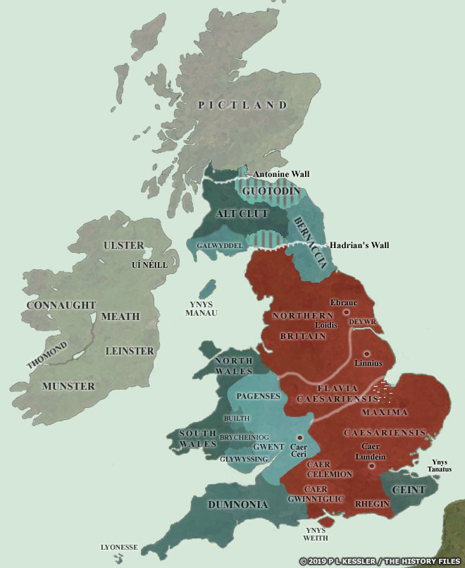 이때쯤 케인트(켄트)가 독립했을 것이고, 둠노니아는 옛 두로트리게스 영토의 소유권을 주장했고, 보르티게른의 파겐세스(포이스)는 웨일스를 통치하게 된 왕국 옆에 있었다. 북쪽은 또한 베르니키아가 생성된 첫 번째 분할로 분열되어 있었다. 포이데라티의 반란, 만연한 전염병, 내전, 야만인들의 침략으로 인해 국가의 응집력이 무너지면서 나머지 로마 속주들도 기껏해야 40년 안에 사라지게 된다.