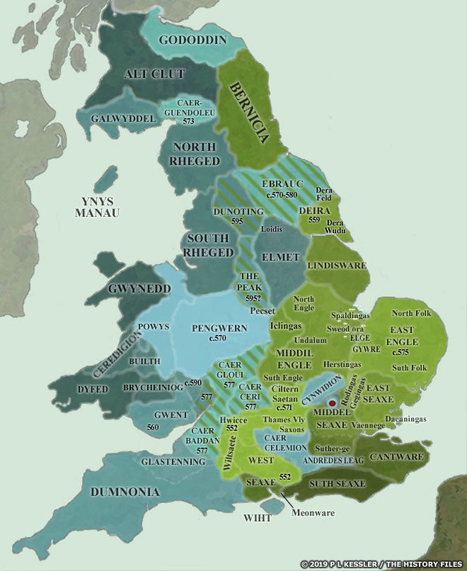 이 시기에 앵글로색슨의 합병이 이루어졌다. 베르니키아와 데이라 앵글족은 서쪽 해안을 확보했고, 엘메트와 고도딘 역시 무너졌다.