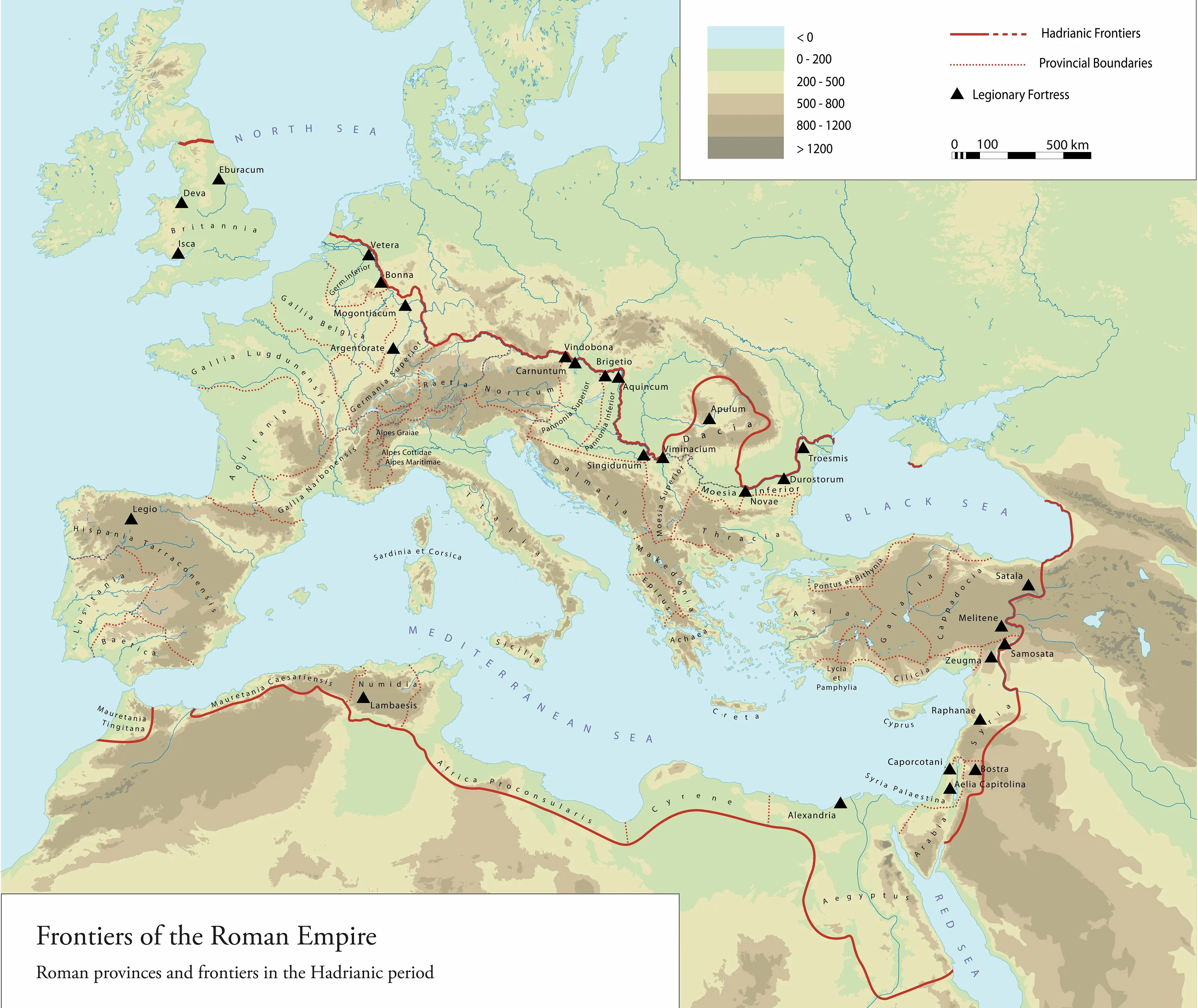 로마 제국 내에서 가장 유명한 방어벽으로, 거의 300년 동안 로마 브리타니아와 칼레도니아의 야만인들을 나누는 주요 경계선 중 하나였다. 북쪽에 세워진 안토니누스 방벽을 제외하면 하드리아누스 방벽은 제국 전역에서 유일했다. 하드리아누스 황제가 122년에 건설을 명령하여 브리타니아의 총독 플라토리우스 네포스에 의해 작업이 시작되었으며 126년경에 완공되었다. 방벽은 월센드(세게두눔)에서 보니스온솔웨이(또는 솔웨이 퍼스)까지 약 73 마일(80 로마 마일)에 걸쳐 있었다. 방벽은 가공할만한 수호자가 아니라 로마의 존재를 유지할 수 있는 기지로 계획되었다. 주로 보조군으로 구성된 로마군은 탑에 병력을 배치하여 국경을 감시하고 수비적으로 모든 대규모 적군과 싸워야 했다. 직접적인 공격이 있을 경우, 적절한 방어뿐이었데, 아마도 때때로 브리타니아에서 로마 세력의 붕괴를 설명할 수 있을 것이다.