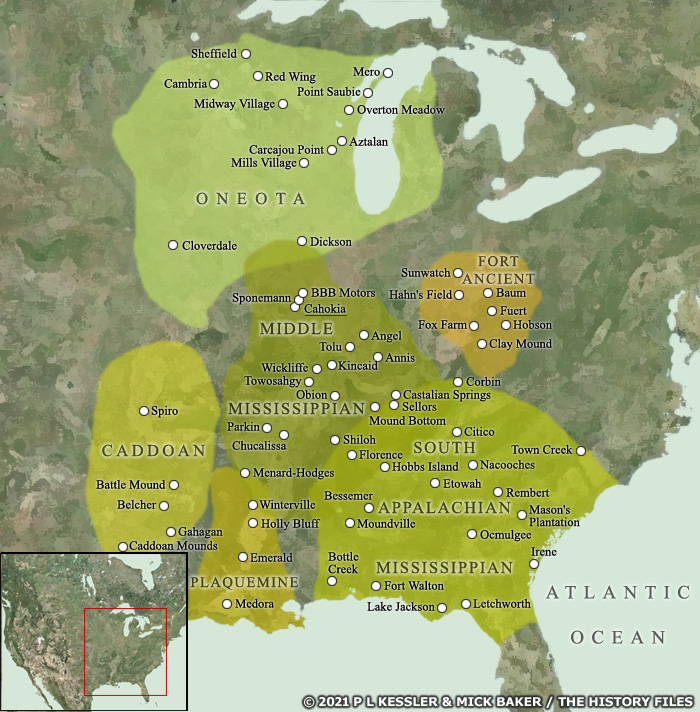 루이지애나 북서부, 텍사스 동부, 아칸소 남서부의 카도 문화, 에토와 마운드빌의 사우스 애팔래치아 문화, 루이지애나 남부와 미시시피의 플라크마인 문화, 동부 평원과 오대호의 오네오타 문화의 형태에도 변화가 존재했다.