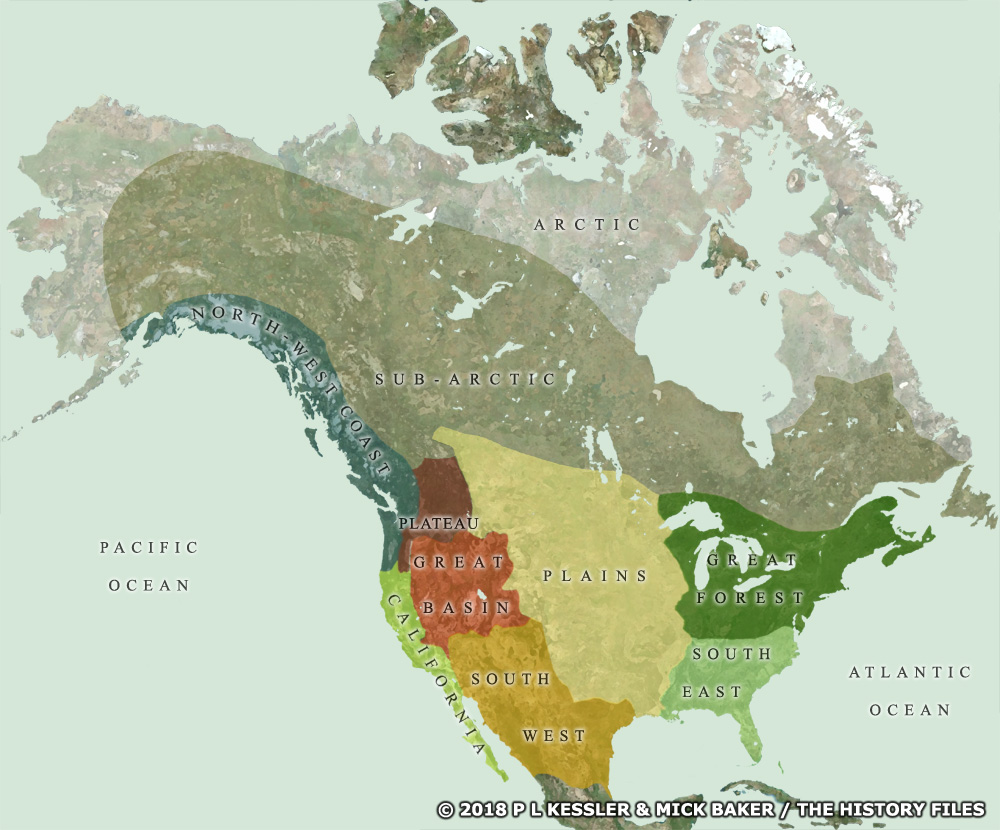 북아메리카에는 10개의 지역(또는 문화 영역)이 있다. 프랑스인, 영국인, 스페인인이 처음으로 접한 것은 대삼림(그레이트 포레스트)과 남동부 지역의 원주민들이었으며, 아북극 부족과의 접촉 정도는 다소 적었다. 미국이 형성되기 전까지 평원(플레인스) 원주민들과 진지한 접촉은 거의 없었다.