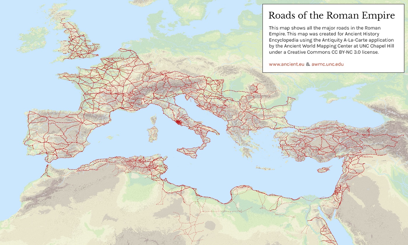 로마 제국의 성장이 정점에 달했을 때, 로마에서 뻗어 나온 약 29개의 큰 군사 도로와 372개의 대로가 후기 로마 제국의 113개 속주를 연결했다. 전체 40만 km(25만 마일)가 넘는 도로가 놓였고, 그중 80,500 km(5만 마일) 이상이 돌로 포장되었다.