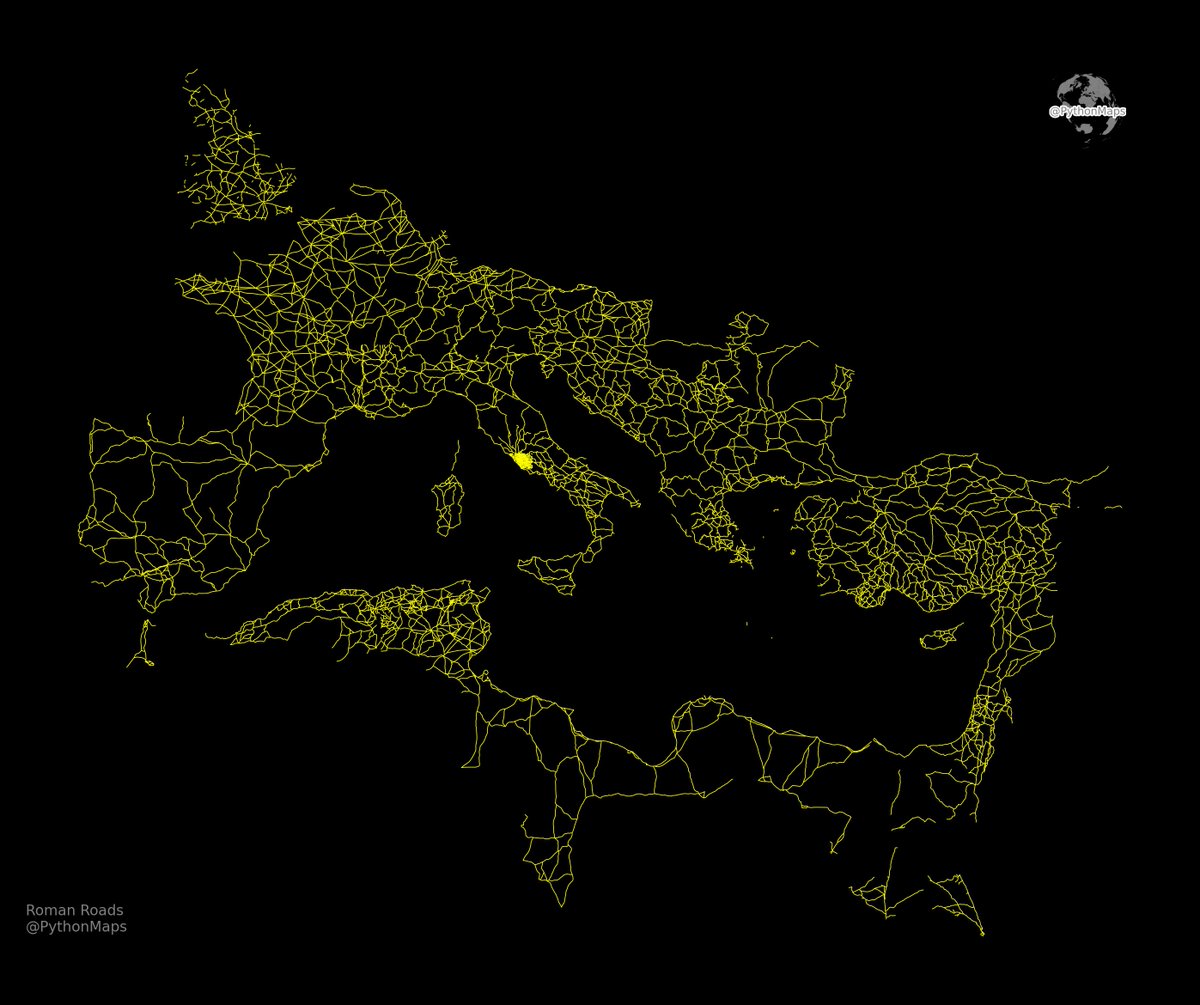 이렇게 거대한 제국의 성장과 유지를 위해서는 잘 발달된 도로망이 필수적이었다. 아래의 지도는 이 위대한 제국에서 도로 건설의 범위를 보여준다.