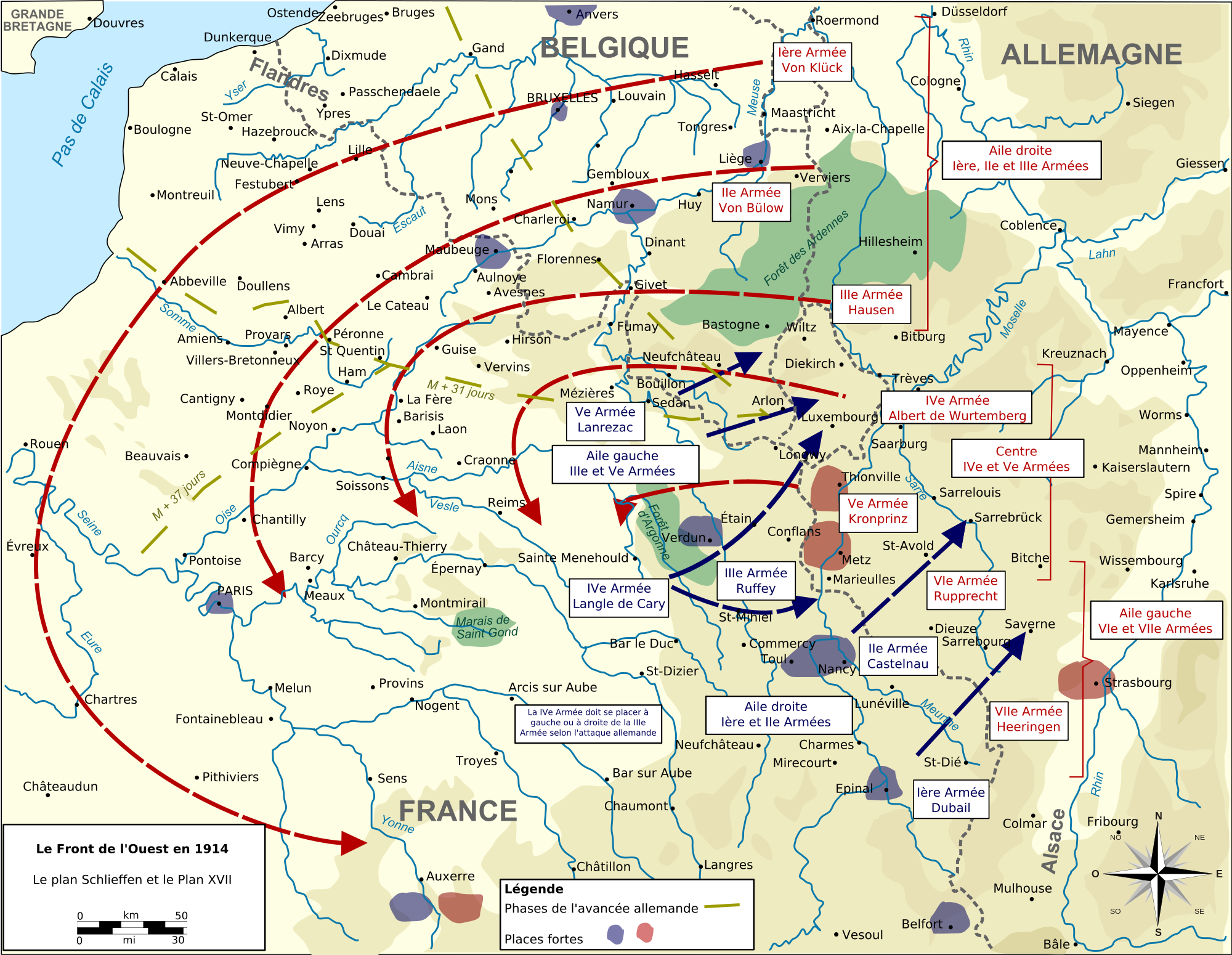 독일과 프랑스의 전쟁 계획가들은 모두 전쟁이 공격적이 될 것이라고 믿었다. 전략가 알프레트 폰 슐리펜이 고안한 독일의 계획은 독일군이 주로 벨기에를 거쳐 프랑스 영토로 빠르게 진격하는 것이었다. 프랑스의 전략인 플랜 XVII는 룩셈부르크와 벨기에를 통과하여 프랑스-독일 국경 너머로 프랑스군을 바로 파병하는 것이었다. 이는 전쟁 기간 동안 주요 전선이 어디에 있었는지 부분적으로 설명하지만, 일부 역사학자들에 따르면 계획은 그 이상을 의미한다. 매우 논쟁적인 학설은 제1차 세계대전이 이러한 계획으로 인해 일어났다고 주장하는데, 모든 국가들이 승리의 열쇠는 신속한 공세이며, 이러한 조건 하에서 전쟁은 빠르고 비교적 저렴하게 승리할 수 있다고 믿었기 때문이다.