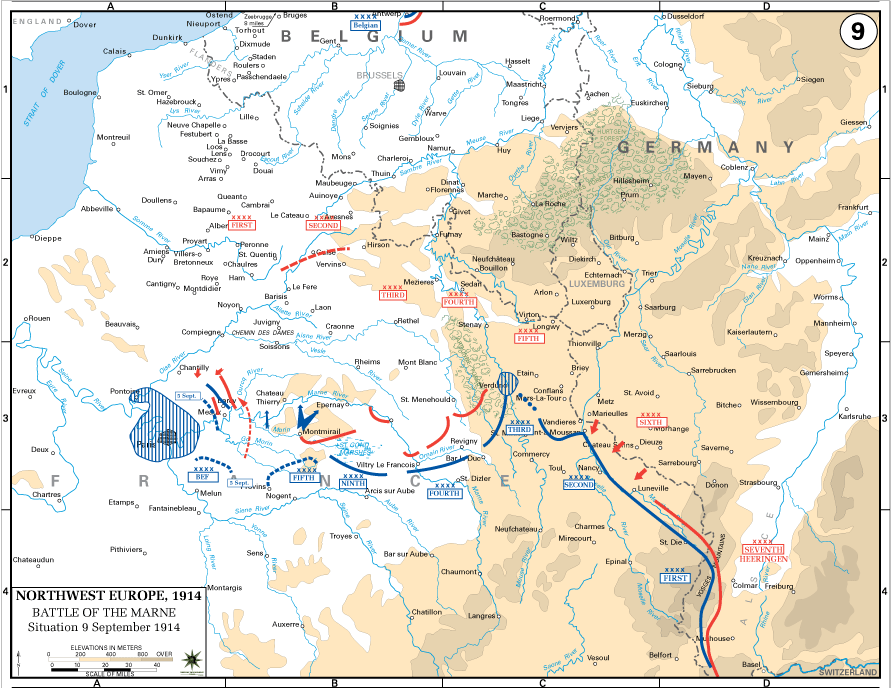 어떤 의미에서 1914년 9월의 충돌은 전쟁에서 결정적인 전투였다. 독일의 프랑스 진출은 파리 외곽의 마른 강 근처에서 프랑스-영국 연합군에게 저지되었고, 독일군은 후퇴할 수밖에 없었다. 이러한 초기 단계에서 전쟁이 너무 빠르게 진행되어 적군은 고정된 진지를 확보하지 못했고, 파리 교외의 성급한 방어에는 빠르게 집결된 시내 수송 함대를 통해 도시에서 전선으로 증원군을 보내는 것이 포함되었다. 이어진 전투에서 독일과 연합군이 북해까지 전선이 닿아 더 이상의 기동전이 불가능해질 때까지 서로의 측면을 공격하려고 시도했지만 실패한 이른바 '바다로의 경주'가 벌어졌다. 참호전으로 교착상태에 빠진 서부전선이 그 뒤를 이었다. 독일의 전략적 전쟁 계획(러시아와 싸우기 위한 군대를 동부로 보낼 수 있도록 프랑스를 빠르게 제압하는 것)은 근본적으로 실패했다.