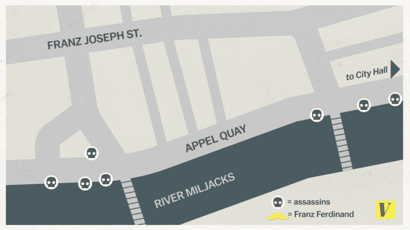 1914년 6월 28일 오스트리아-헝가리 제국의 대공 프란츠 페르디난트가 합스부르크 영토의 일부였던 사라예보에 도착했다. 그는 왕위 계승 서열에서 저명한 온건파를 제거하여 빈과 남슬라브 주민 사이의 긴장을 고조시키고자 도시에서 그를 살해하려는 7명의 세르비아 테러리스트들을 만났다. 첫 번째 암살자는 경찰관 근처에 서 있었기에 무기를 사용하지 않았다. 두 번째 암살자는 수류탄을 던져 여러 명에게 부상을 입혔다. 그다음 차량 행렬은 다른 암살자들을 지나쳐갔지만, 소란 중에 명확한 사격이 없었기 때문에 아무도 행동하지 않았다. 암살자들은 그들의 음모가 실패했다고 믿었다. 프란츠 페르디난트는 수류탄으로 다친 사람들을 살필 수 있도록 차를 돌리라고 명령했지만 운전자는 이를 오해했고, 원래 경로를 따라가다가 다시 돌리려고 하면서 차가 멈췄다. 우연하게도 이때 프란츠 요제프 스트리트로 이동한 가브릴로 프린치프가 치명적인 총격을 날릴 수 있었다.