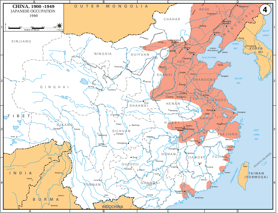 사람들은 종종 제2차 세계대전을 독일이 폴란드를 침공한 1939년 9월에 시작되었다고 묘사한다. 그러나 일본과 중국은 당시에 이미 몇 년 전부터 전쟁을 벌이고 있었다. 1930년대 초 중국은 정치적으로 혼란스러웠고 일본은 영토 확장의 기회를 보았다. 일본은 1932년 만주에 괴뢰국가 만주국을 세우고 군대를 파견하였고 긴장은 1937년에 전면전으로 확대되었다. 이 지도는 1940년의 상황을 보여주고 있는데, 분홍색 지역은 일본의 지배하에 있었다. 일본은 중국을 완전히 장악하지 못했지만, 장제스(창카이섹) 휘하의 중국군도 미국의 도움 없이는 일본군을 중국 영토에서 몰아낼 수 없었다.