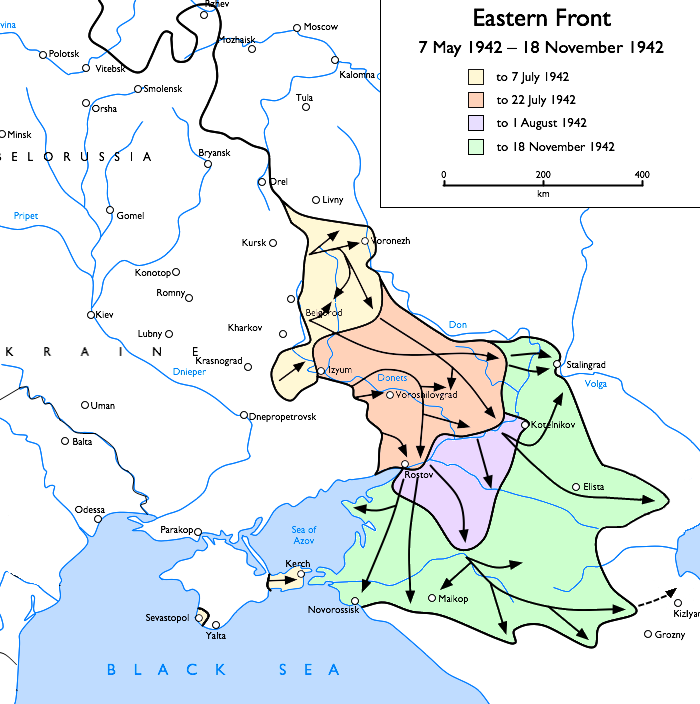 1941년 캠페인에서 북쪽의 도시 모스크바와 레닌그라드를 점령하려다 실패한 이후, 히틀러는 1942년에 관심을 남쪽으로 돌렸다. 계획은 코카서스와 그곳의 풍부한 유전들을 점령하는 것이었다. 그러나 역사학자 맥스 헤이스팅스가 "동방 전쟁의 결정적인 실수"라고 부르는, 히틀러는 7월에 지도 우측에 있는 스탈린그라드를 점령하기 위해 군대의 상당 부분을 돌리기로 결정했다. 스탈린그라드는 어떠한 전략적 중요성도 가지고 있지 않았지만, 도시의 이름은 히틀러와 스탈린 모두에게 상징적인 의미를 전투에 부여했다. 독일군이 한 번에 한 건물씩 점령하려고 하면서 몇 주간의 잔혹한 시가전이 이어졌다. 11월, 소련군은 도시를 구하기 위해 반격을 개시하여 독일군을 포위하고 수만 명의 포로를 잡았다. 스탈린그라드 전투로 독일군은 80만 명 이상의 사상자가 발생했고 소련군은 100만 명 이상의 사상자를 냈다. 많은 역사학자들은 스탈린그라드 전투를 유럽 전쟁의 결정적인 전환점이라고 생각한다.