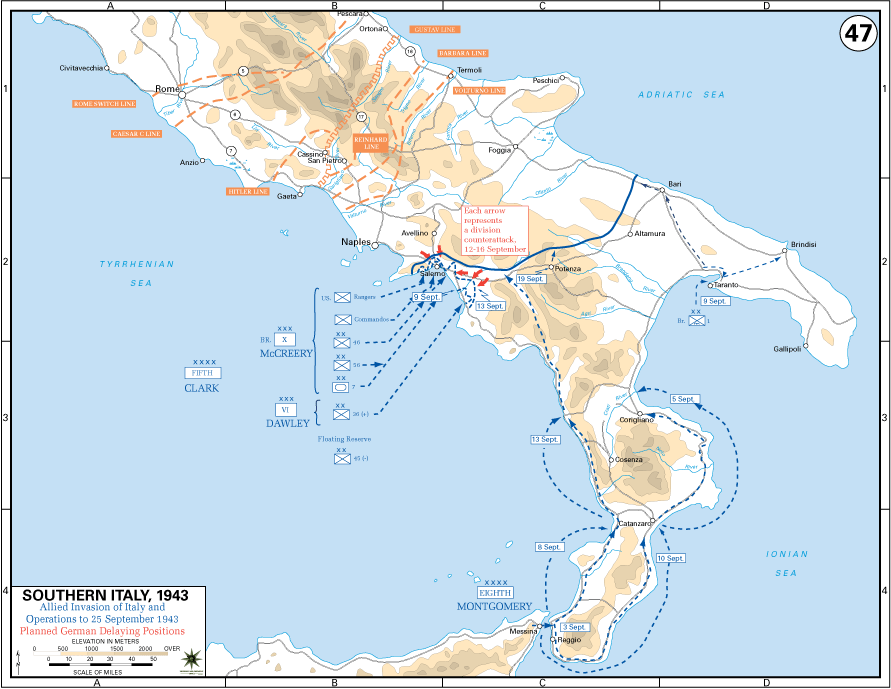 1943년, 서방 연합국은 여전히 프랑스에서 독일군을 직접 공격할 수 있을 만큼 강한지 의심했다. 그래서 그들은 대신 이탈리아 반도를 공격했다. 그들은 이탈리아를 전쟁에서 몰아내고, 독일이 연합국과 홀로 싸우도록 하기를 바랐다. 1943년 9월 이탈리아에 대한 상륙작전이 시작되었다. 연합군이 이탈리아 반도를 따라 진군하기는 했지만, 전쟁의 결과에 결정적인 역할을 하기에는 너무 느렸다. 영국군과 미군이 9개월 후 프랑스에 상륙하여 또 다른 전선을 열었을 때에도 여전히 북쪽으로 진군하고 있었다.