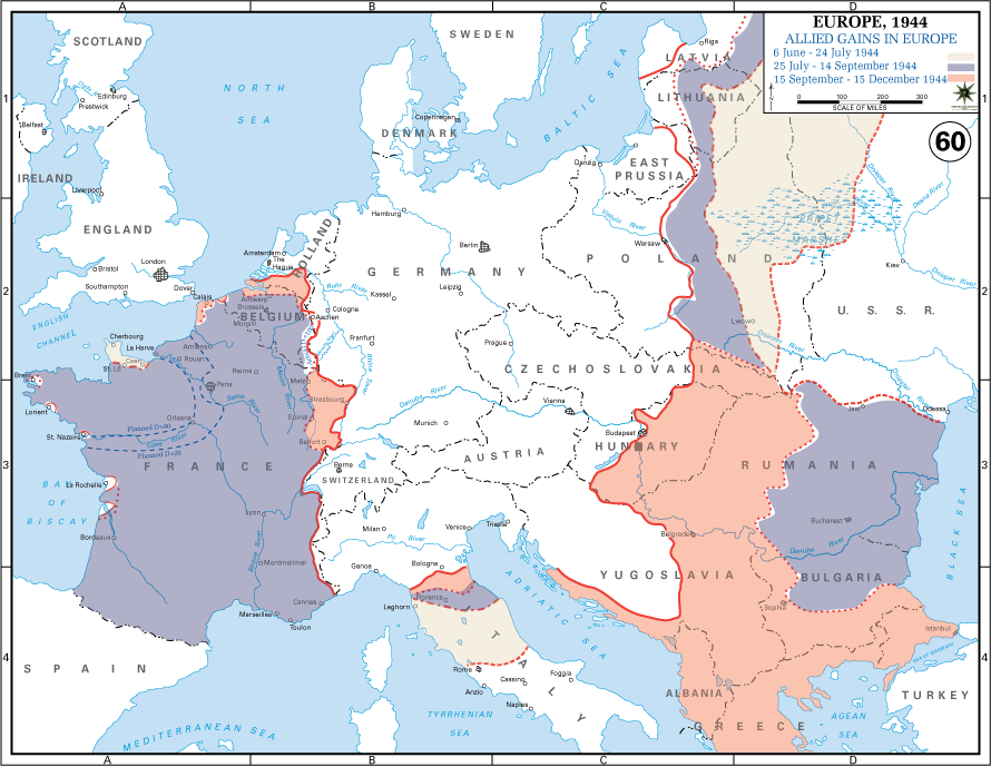 오버로드 작전이 성공했다. 1944년 여름과 가을, 유럽의 추축국은 모든 전선에서 후퇴했다. 서쪽에서는 영국군, 미군, 프랑스군이 프랑스를 탈환했다. 동쪽에서는 소련이 폴란드, 헝가리, 체코슬로바키아, 발칸 국가들의 일부를 점령했다. 연합군은 이탈리아 전선에서도 어느 정도 전진했다. 이러한 진전은 1945년 독일 본국에 대한 마지막 진격을 위한 발판을 마련했다.
