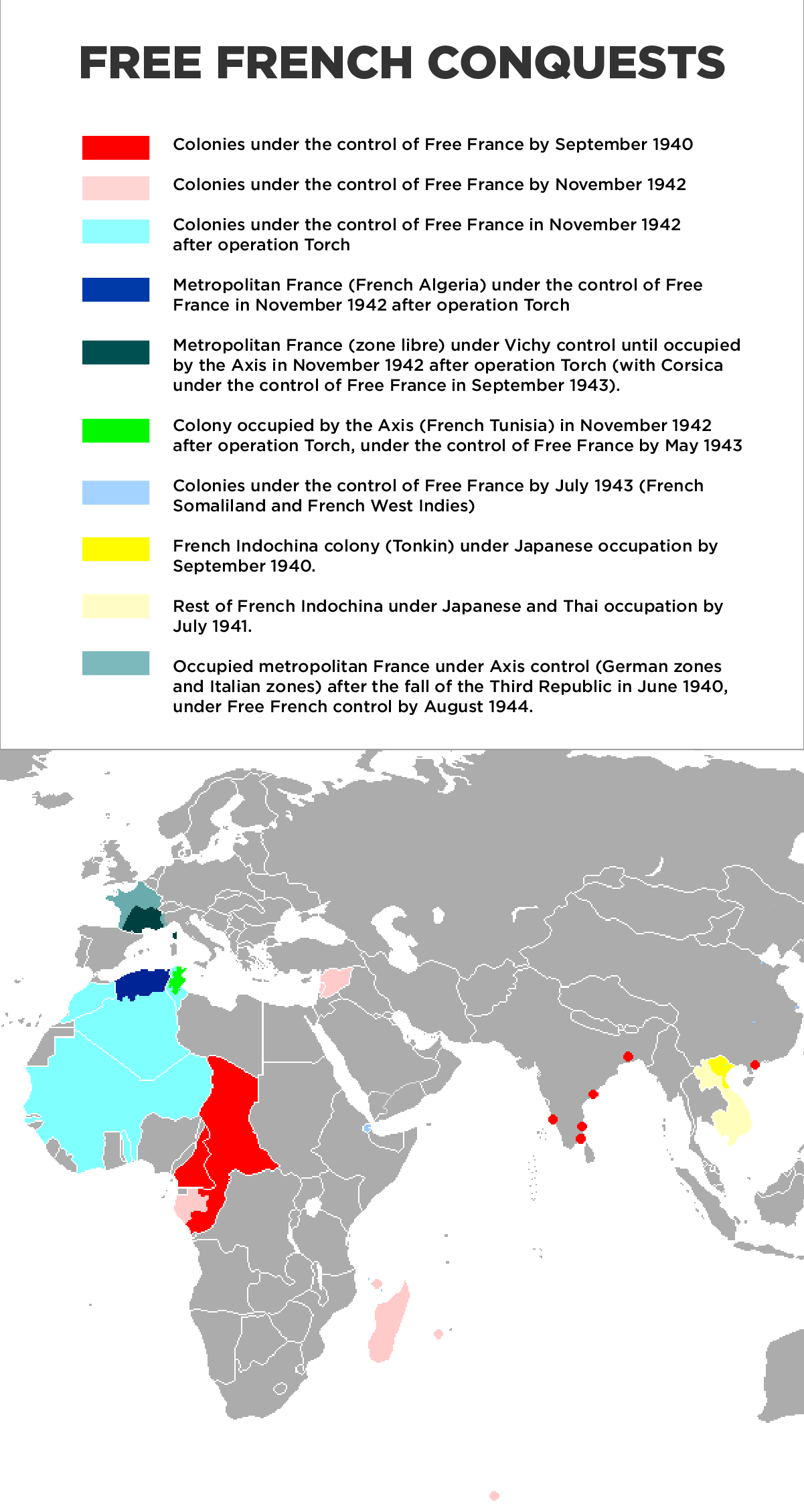 덩케르크로 철수한 프랑스군 중 4분의 3은 나치에 우호적인 비시 정권의 아래에 있는 프랑스로 돌아갈 것을 요구받았다. 그러나 소수의 프랑스군은 샤를 드골이 이끄는 망명 정부인 자유 프랑스에 합류하기로 결정했다. 그 후 몇 년 동안, 드골과 그의 군대는 연합군과 함께 싸웠다. 이 지도는 드골의 연합군에 대한 가장 중요한 공헌 중 하나를 보여준다. 즉, 비시 정부로부터 많은 프랑스 식민지의 지배권을 빼앗은 것이다. 이러한 군사적 승리는 히틀러에게 절실하게 필요한 자원을 빼앗는 동시에 프랑스 국민의 눈에 드골의 정통성을 쌓았다.