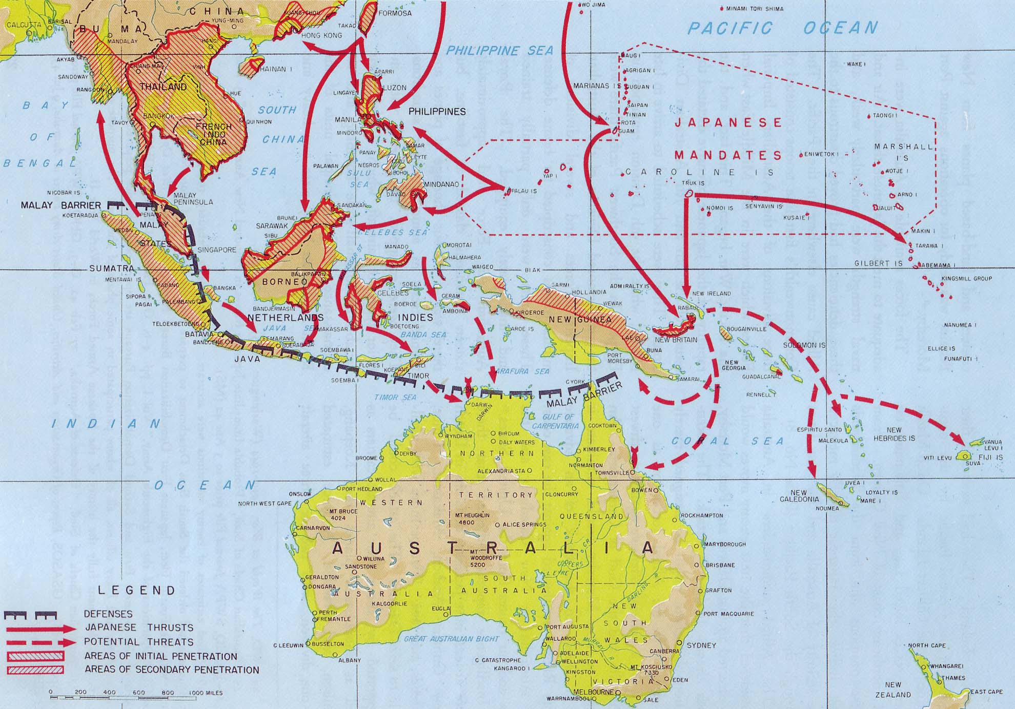 일본의 진주만 공격은 미 해군을 무력화시키고 태평양에서의 야심 찬 군사작전을 위한 길을 열기 위한 것이었다. 이는 태평양의 미군 최고 사령관 중 한 명인 더글러스 맥아더가 작성한 지도에서 잘 드러난다. (실선은 실제 일본의 공격을 나타내고, 점선은 미국인들이 우려한 다음 공격의 예측을 나타낸다)  하와이 공격 이후 몇 달 동안 일본군은 필리핀, 버마, 뉴기니, 네덜란드령 동인도를 공격했다. 일본군은 12월에 영국령 홍콩을, 2월에는 영국령 싱가포르를 점령했다. 1942년 여름까지 일본은 동남아시아의 넓은 지역을 정복하여 서구 국가들이 오랫동안 이 지역을 지배할 수 있었던 유럽과 미국의 무적의 기운을 산산조각 냈다.