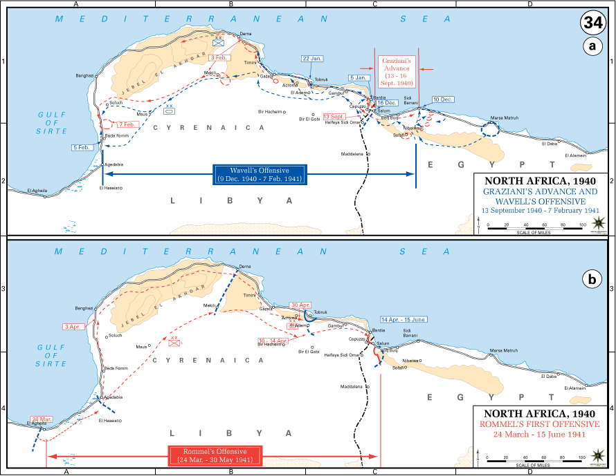 프랑스가 함락된 후 영국은 추축국이 장악한 유럽 대륙의 상륙작전을 시작하는데 필요한 군사력을 갖추지 못했다. 그러나 영국의 수상 윈스턴 처칠은 국민들에게 영국이 파시즘에 맞서 싸우는 데 계속 기여할 수 있다는 것을 보여주고 싶어 했다. 그래서 그는 북아프리카에 군대를 파견했고, 그곳에서 독일의 동맹 이탈리아인들을 그들의 식민지인 리비아에서 몰아내기를 희망했다. 영국군은 이탈리아군을 격파하고 수만 명의 포로를 잡았다. 그러나 화가 난 히틀러는 뛰어난 에르빈 롬멜이 이끄는 독일군을 파견하였고, 그는 영국군의 우위를 일부 뒤집고 북아프리카 전쟁을 2년 더 연장할 수 있었다.
