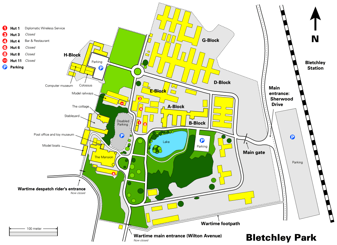 영국과 미국은 엄청난 전략적 이점을 누렸다. 전쟁의 상당 부분에서 그들은 적의 암호 메시지를 해독할 수 있었다. 영국 암호 해독의 중심지는 런던에서 북서쪽으로 약 50 마일 떨어진 블레츨리 파크였다. 여기에서 9,000명의 지원 직원(대부분 여성)의 지원을 받는 뛰어난 수학자들과 암호 해독가들로 이루어진 팀이 무전으로 전송되는 암호화된 적의 메시지를 분석했다. 독일의 정교한 암호를 해독할 수 있도록 블레츨리 파크 팀은 현대 컴퓨터의 선구자가 된 세계에서 가장 정교한 컴퓨팅 장치 중 일부를 만들었다. 미국의 암호 해독가는 일본의 암호를 해독하는 데 있어서 비슷한 성공을 누렸다. 영국의 수상 윈스턴 처칠, 미군 사령관 드와이트 아이젠하워, 그리고 다른 관측통들은 모두 이러한 암호 해독 노력을 전쟁에서 승리한 공로로 인정했다. 이 지도는 박물관으로 바뀐 오늘날의 블레츨리 파크를 보여준다.