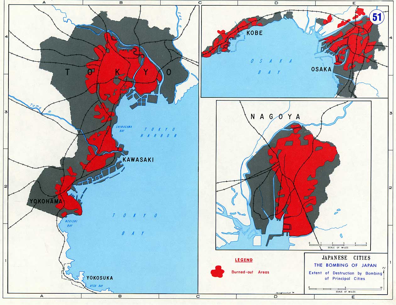 1945년 초 태평양 전쟁이 막바지에 이르렀을 때, 미국의 폭격기들은 일본의 주요 도시들을 폭격하기 시작했다. 미군 사관학교에서 가져온 이 지도는 일본에서 가장 큰 6개 도시의 피해 규모를 보여주고 있다. 1945년 3월 9-10일 밤 단 한 번의 도쿄 공습으로 10만 명 이상이 사망했다. 이는 전쟁 중 가장 치명적인 공습이었을 것이다.