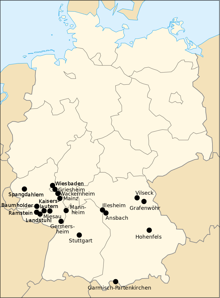 전쟁이 끝난 후, 미국은 국가의 재건을 감독하고, 안정을 보장하며, 독일에서 또 다른 군국주의 정권이 장악하는 것을 방지하기 위해 독일에 군사 기지를 설치했다. 70여 년이 지난 지금도 많은 기지가 독일에 있으며(이 지도에는 2008년의 기지들이 표시되어 있다), 약 4만 명의 미군이 주둔하고 있다. 미군이 주둔하고 독일이 반소련(그리고 이제는 사실상 반러시아) NATO 동맹에 가입함으로써 독일은 국내총생산(GDP)의 1.4 %만을 국방비로 지출했으며, 이는 미국 지출의 약 3분의 1에 해당한다.