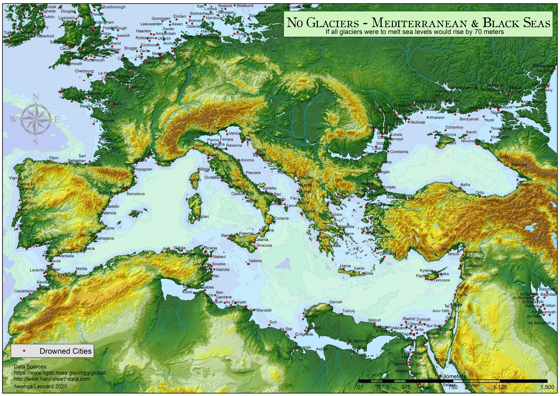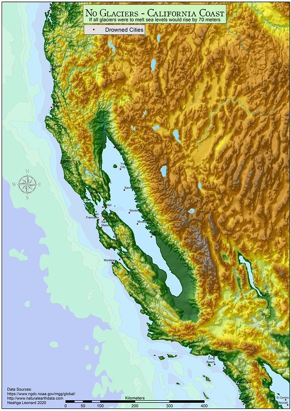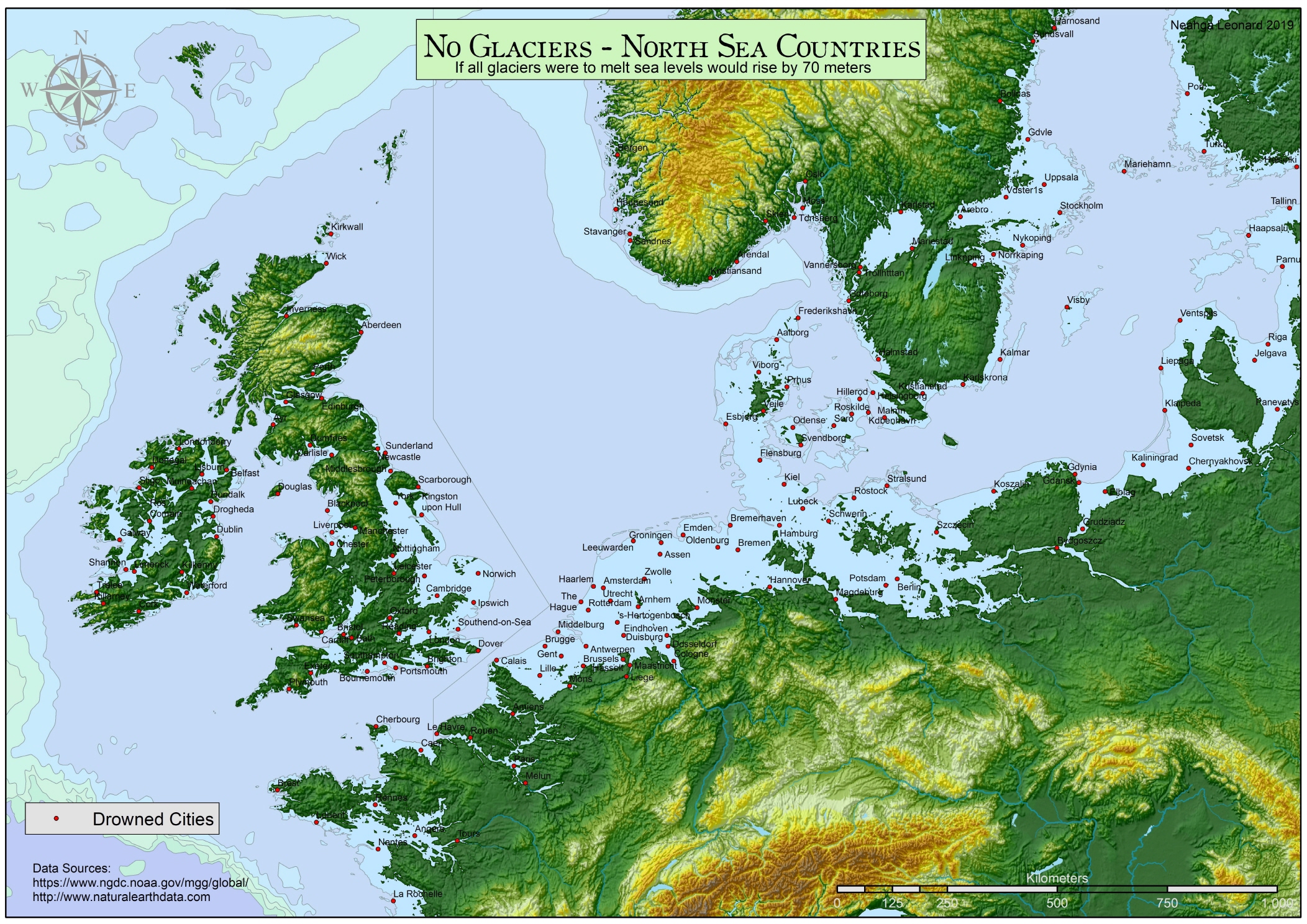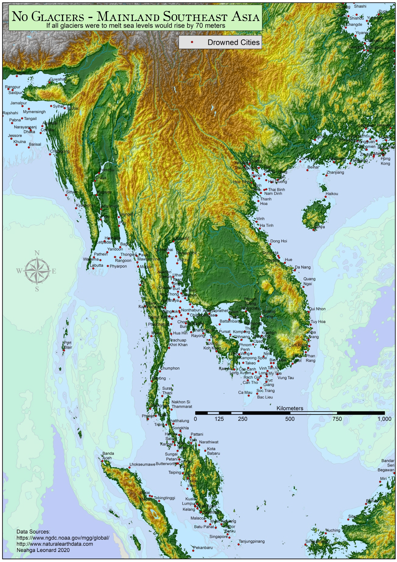유저 7LeagueBoots는 전 세계 바다가 70 미터(230 피트) 상승할 때 바닷가에 위치한 도시들에 어떤 일이 일어날지 생생하게 보여주는 지도책을 만들었다.