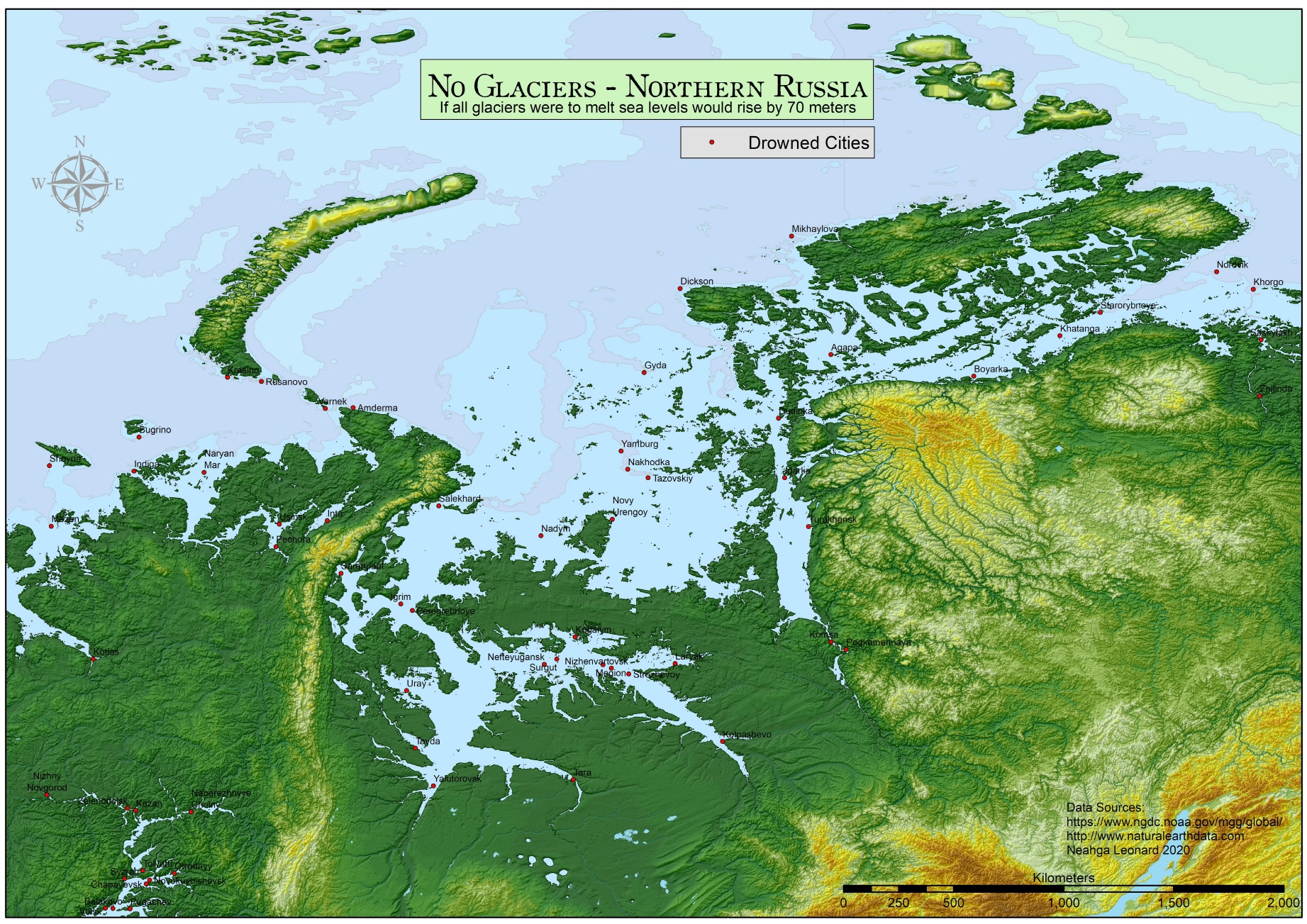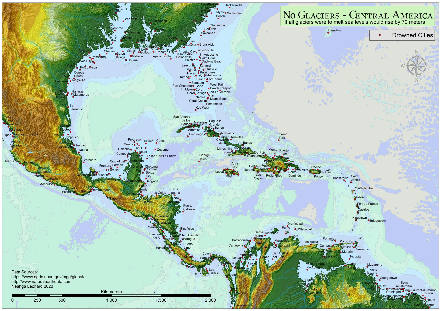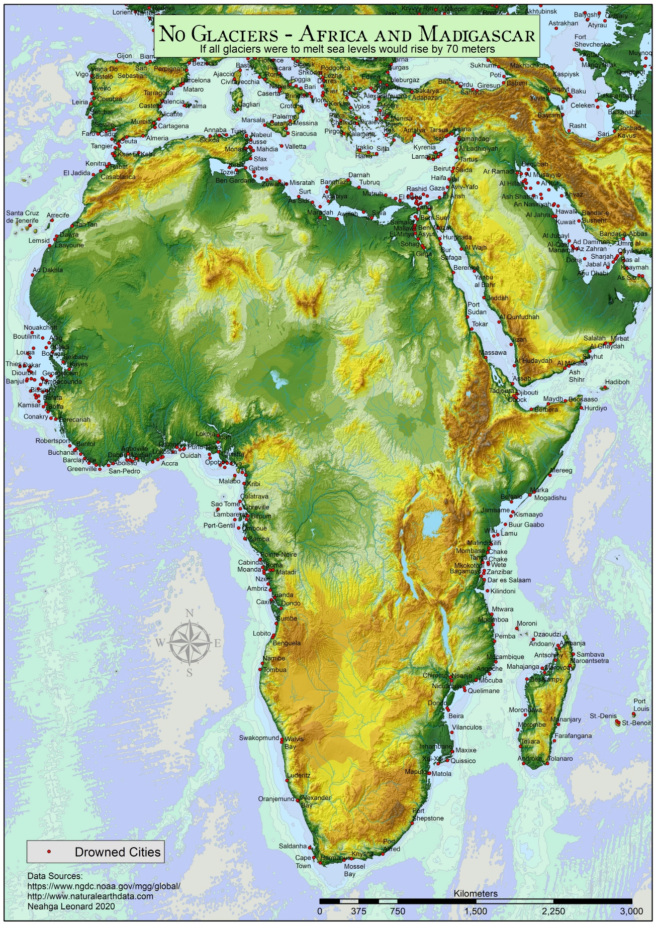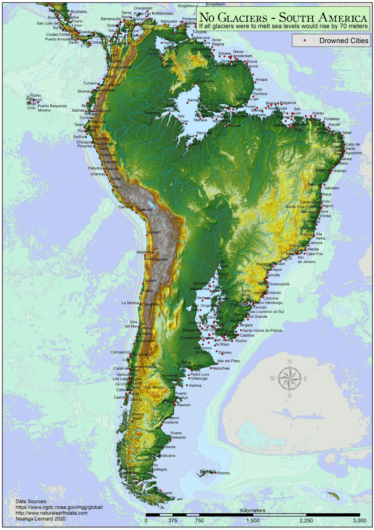 만약 남극 대륙, 그린란드(남극 대륙은 약 60 미터 해수면 상승, 그린란드는 약 7.4 미터), 그리고 지구 상의 만년설이 모두 녹는다면, 해수면은 약 70 미터(230 피트) 상승하고 모든 해안 도시를 덮을 것이다.