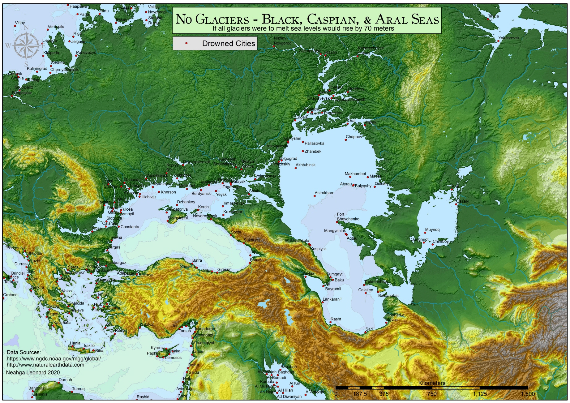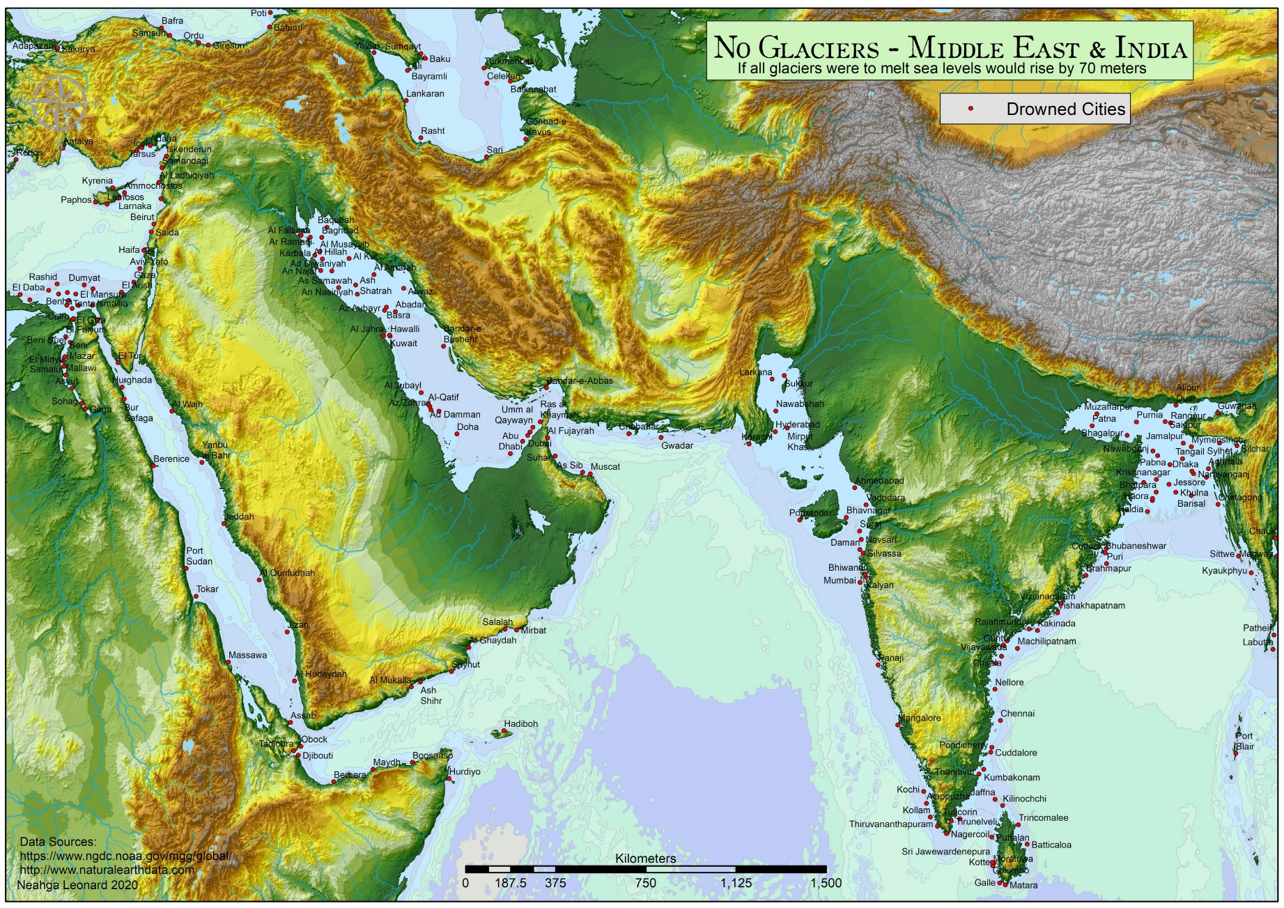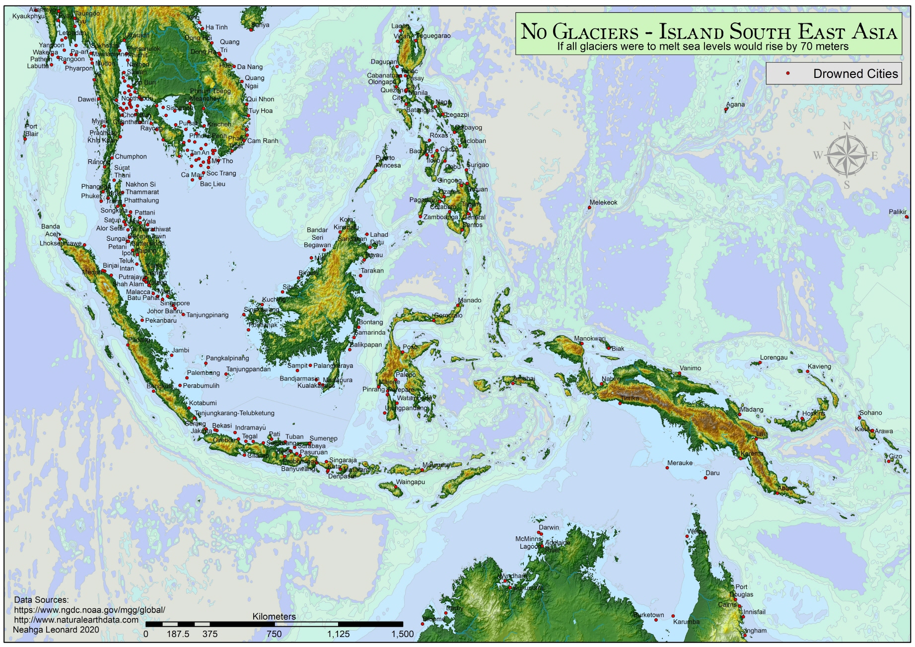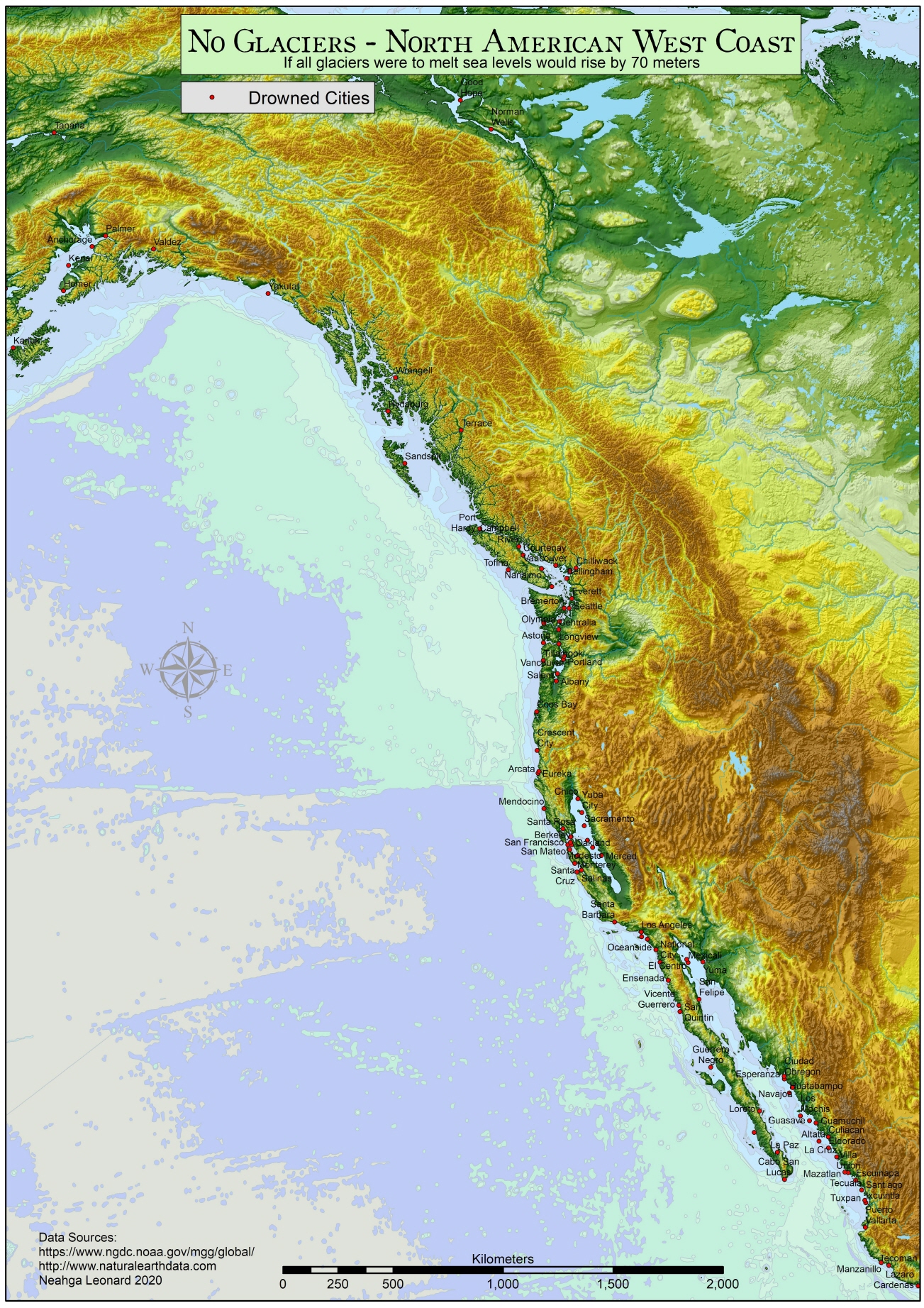 만약 남극 대륙, 그린란드(남극 대륙은 약 60 미터 해수면 상승, 그린란드는 약 7.4 미터), 그리고 지구 상의 만년설이 모두 녹는다면, 해수면은 약 70 미터(230 피트) 상승하고 모든 해안 도시를 덮을 것이다.
